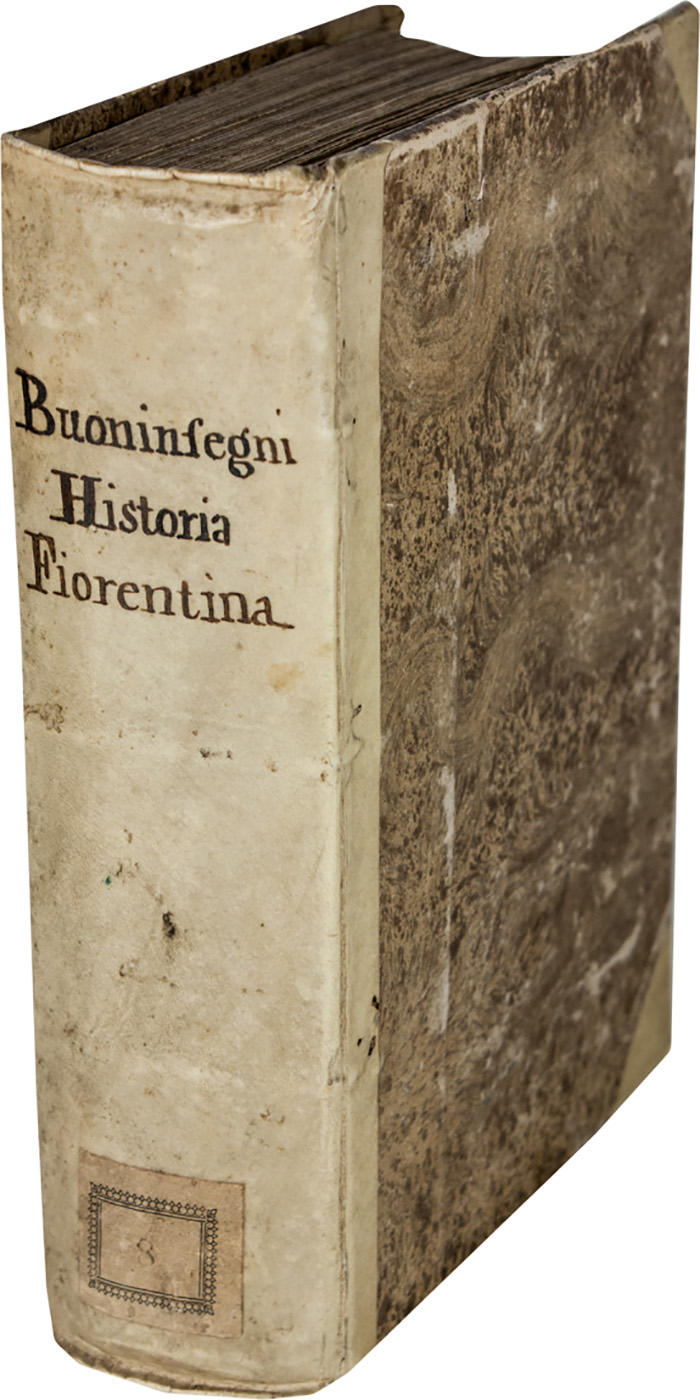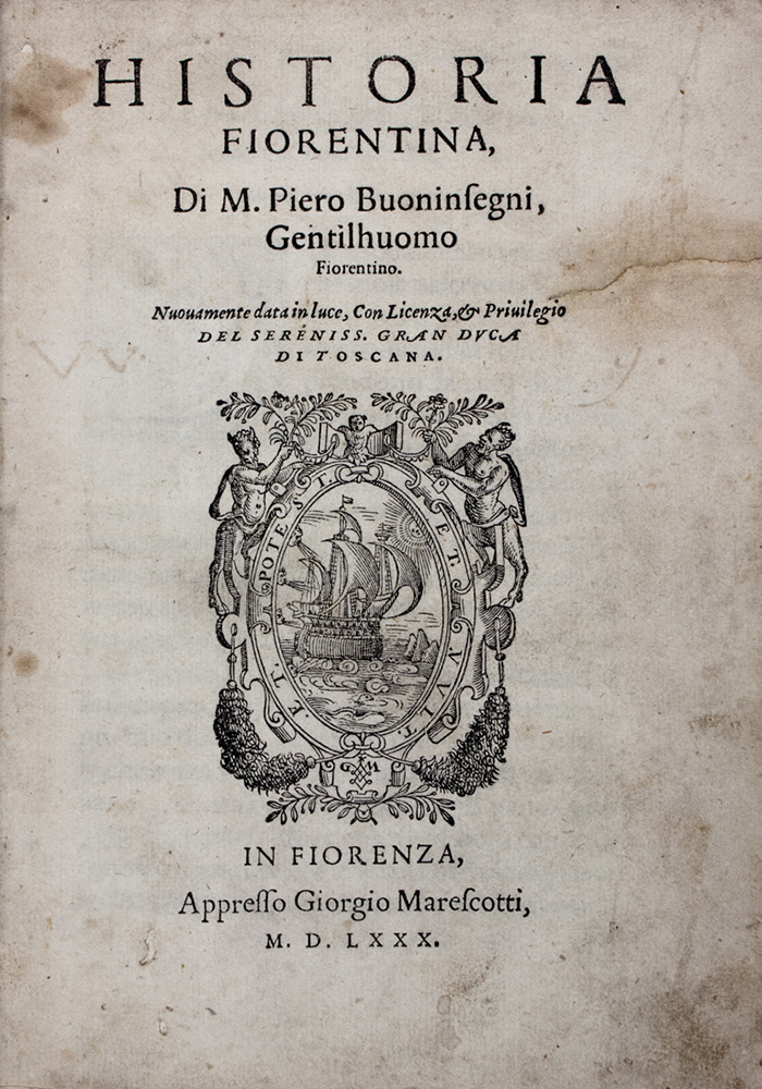Non comune edizione originale in variante B che reca come data di edizione al colophon il 1579. Cfr. Moreni I, 191-92; Colbacchini, 300: «Originale edizione molto rara, testo di lingua». Questa storia fedele ed interessantissima che narra le vicende di Firenze dalla fondazione al 1410, come è noto, fu pubblicata per errore sotto il nome di Pietro Buoninsegni, figlio di Domenico.
