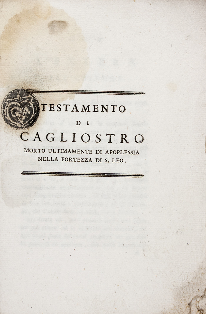 Cagliostro Alessandro (conte di) [pseud. di Balsamo Giuseppe], Testamento di Cagliostro morto ultimamente di apoplessia nella fortezza di S. Leo.
