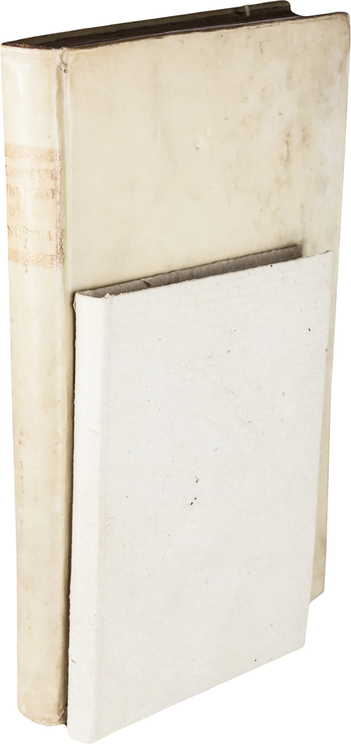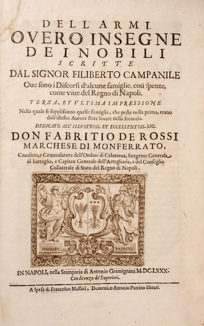 In-4° grande (mm 315x205). Pagine [10], 303, [1]. Marca incisa in rame al frontespizio. Numerosi stemmi incisi in legno. Alcune carte con brunitura più evidente e mancanza a pagina 87 senza perdita di testo. Legatura in piena pergamena rigida con titoli al dorso. SI AGGIUNGE: De Blasio Agnello Alessio, Ragguaglio istorico della famiglia Villani. In Napoli: presso il De Bonis stampatore arcivescovale, 1693. In-4° (mm 215x155). Pagine [28], 55 e 1 carta ripiegata in fine. Numerosi finalini incisi in legno e grande calcografia all'introduzione. Legatura in cartonato. Ottima copia. (2)