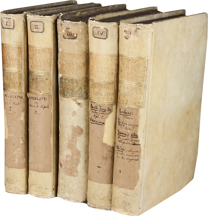 I volumi raccolgono le opere di Di Costanzo Angelo, Pontano Giovanni Gioviano, Castaldo Antonino, D'Andrea Alessandro, Della Torre Raffaele, Parrino Domenico Antonio, Giannone Pietro, Spinelli Matteo, Collenuccio Pandolfo, Pellegrino Camillo, Capaccio Giulio Cesare e Giannone Pietro. Collazione dei singoli volumi su richiesta.