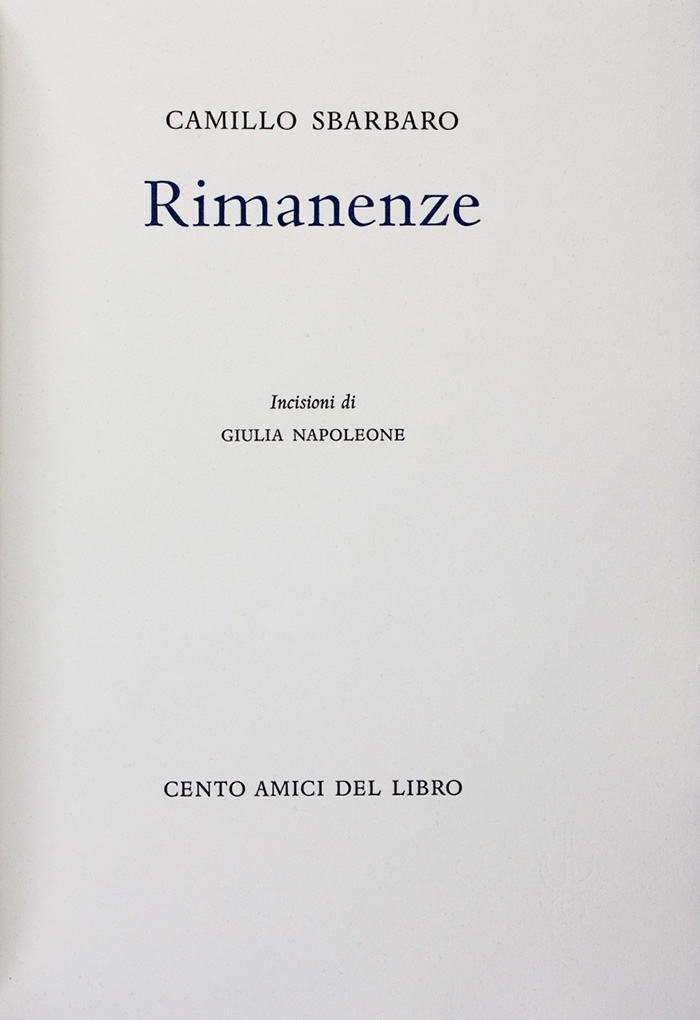 In-4° (mm 300x215). Pagine [4], 44, [12] con 7 incisioni di Giulia Napoleone. Edizione stampata in 150 esemplari su carta a tino Magnani, la nostra è la copia ad personam. Brossura editoriale con titoli al piatto anteriore e al dorso e custodia. Copia in ottimo stato di conservazione. SI AGGIUNGE: Id., Rimanenze. Milano: Cento Amici del Libro, 2001. Cartella-in folio (590x450) contenente le incisioni di Giulia Napoleone stampate in rosso. (2)