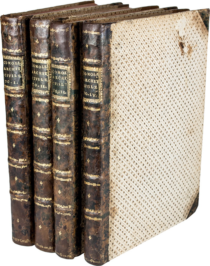 4 volumi in-4° (mm 288x214). Pagine XIV, 330, [4], senza la carta finale di indice; IV, 380; [4], 316; IV, 318, [2]. Con una tabella ripiegata in fine del primo volume. Buon esemplare ad ampi margini, con lievi fioriture e bruniture sparse più accentuate nel secondo volume e un forellino di tarlo nel margine interno delle carte del primo, sempre nel secondo volume minimo restauro marginale al frontespizio. Legatura coeva in mezza pelle con punte, piatti in carta decorata, tagli spruzzati. Dorsi parzialmente ricostruiti in pelle moderna. (4)