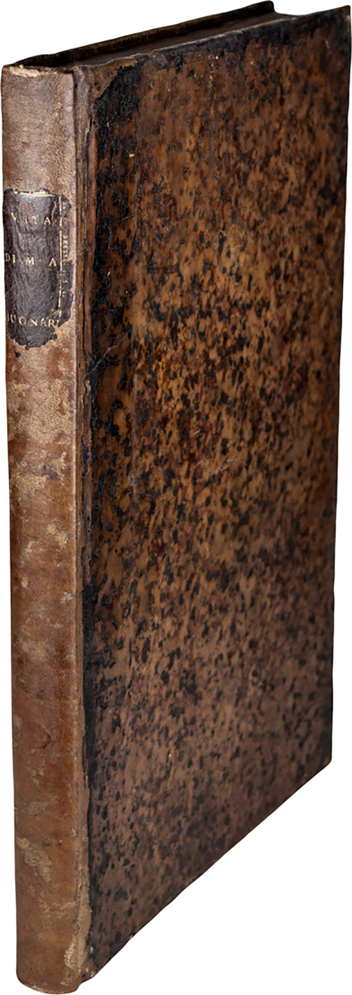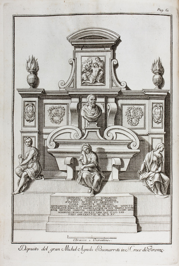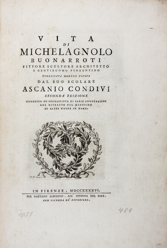 Seconda e migliore edizione dopo quella, introvabile, del Blado impressa nel 1553, notevolmente accresciuta e impreziosita da ornamenti tipografici al testo 5 splendide tavole incise da Franceschini, Mazzoni e Zuccherelli, fra le quali due ritratti di Michelangelo. Cicognara 2244 «con 18 intagli in rame collocati fra il testo relativi alla sua effigie, alle sue opere, al monumento scolpitogli ec.»; Gamba 1331.
