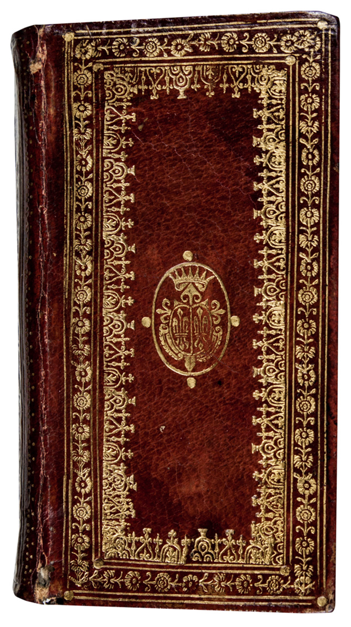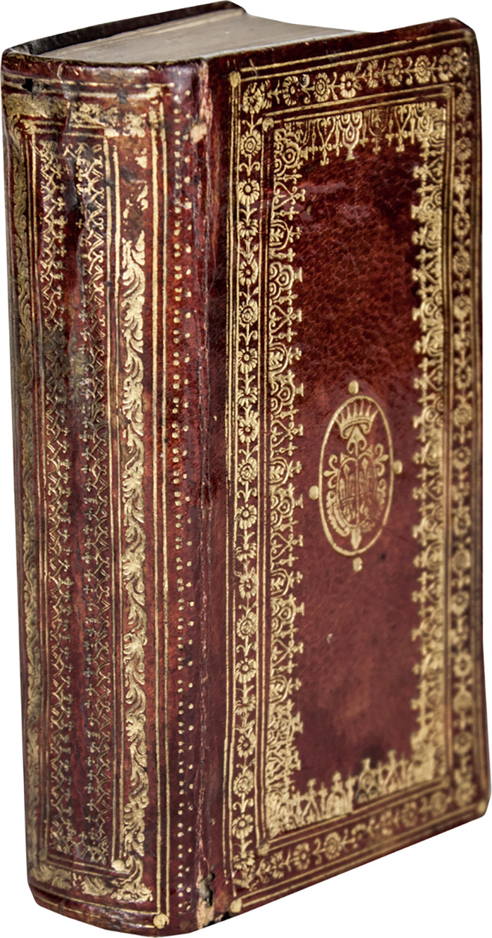 In-24° (mm 106x53). Pagine 447, [1]. Frontespizio inciso in rame con una piccola veduta di Venezia. Esemplare rifilato e con gora d'acqua ai primi due quaderni. Splendida legatura coeva in marocchino rosso proveniente da un atelier parigino del XVIII secolo: piatti con cornice a doppi filetti e armi della famiglia Fugger sormontata dalla corona a sette perle di Freiherr. Dorso completamente decorato con cornici degradanti. Forellino di tarlo al dorso e alla cerniera anteriore.