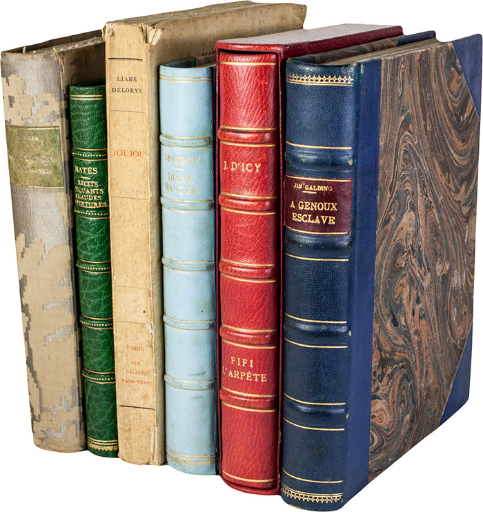 In-8° (mm 200x125). Pagine [4], 196, [2] con 10 belle illustrazioni a piena pagina fuori testo. Esemplare in ottimo stato di conservazione con legatura in mezza pelle verde e dorso a cinque nervi con titoli dorati. SI AGGIUNGE: D'Icy Jacques, Fifì l'Arpète. Paris: Collection des Orties Blanches, [1922]. Pagine [5], 297, [5] con 9 illustrazioni a piena pagina delle quali una a colori. Copia in ottimo stato che conserva la brossura originale all'interno. Legatura in piena pelle rossa con dorso a cinque nervi e titoli e filetti dorati. SI AGGIUNGE: Flogger Arthur William, Les confidences d'un Baronnet (Lady Buttock). Paris: Collection des Orties Blanches, [1929]. René-Michel Desergy, Diana Gantée. Paris: Collection des Orties Blanches, [1932]. Delorys Liane, Joujou ou Les Libertinages du Travesti. Paris: Aux galants passe-temps, 1936. Galding Jim, A genoux esclave. [s.l.]: Les Editions du Couvre-Feu, [1936]. Esemplare numero 189 su una tiratura complessiva di 500 copie. (6)