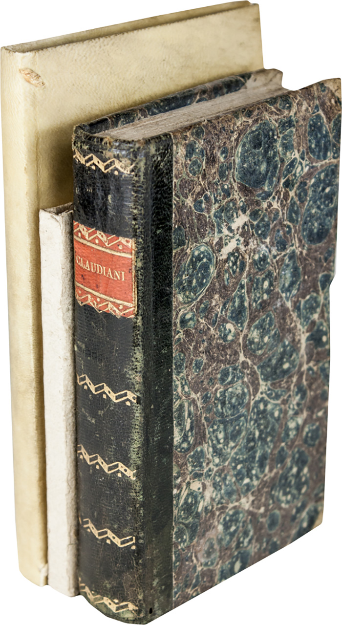 In-8° (mm 162x98). Pagine 134, [18]. Ampia gora d'acqua lungo il volume. Legatura moderna in piena pergamena. SI AGGIUNGE: Claudianus Claudius, Hoc volumine haec continentur [...] In Ruffinum Lib. II. De bello gildonico ... (Al colophon:) Florentiae: per haereds Philippi Iuntae, 1519. In-8° (mm 145x90). Carte 175, [1]. Frontespizio brunito e volume un po' allentato internamente. Legatura settecentesca in mezza pelle, leggere abrasioni ai piatti e punte stanche. SI AGGIUNGE: Del Rio Martin Antonio, Ad Cl. Claudiani opera. Antverpiae: Ex officina Christophori Plantini, 1672. In-16° (mm 116x70). Pagine 80, [4]. Discreto esemplare. Cartonato moderno. (3)