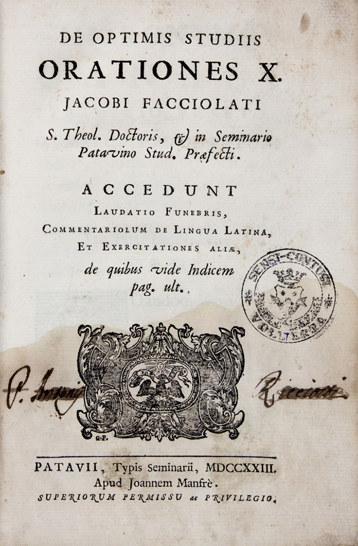 Facciolati Jacopo, De optimis studiis orationes X.Patavii: Typis...