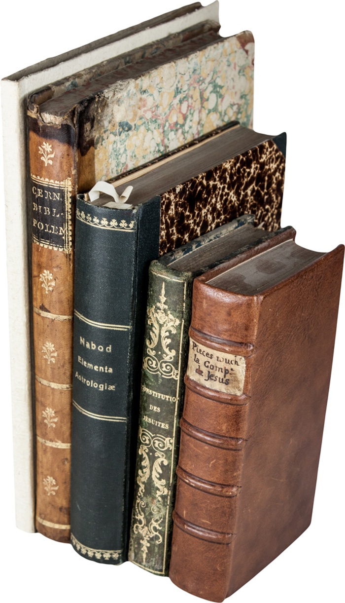 In-4° (mm 247x190). Pagine 66. Esemplare in barbe, con fioriture, in cartonato moderno. SI AGGIUNGE: Forner Andreas, Iubileus quintevangelicus... Ingolstadii: ex officina typographica Ederiana, 1618. 4 opere in 1 volume in-4° (mm). Pagine [16], 222. LEGATO CON: Apologia pro Societate Iesu ex Boemiae Regno... Viennae: Schump, 1618, e altre due opere. Esemplare privo di legatura. SI AGGIUNGE: Petit-Pied Nicolas, Recueil de pieces touchant l'Histoire de la Compagnie de Jesus. A Liege: S.e., 1716. In-8° (mm 160x90). Pagine XXI, [1], 539, [1], con 1 tavola incisa in rame fuori testo più volte ripiegata. Buona copia. Legatura moderna in piena pelle. Due timbri di collezione privata al frontespizio. Nel lotto anche Compte rendu des constitutions des Jesuites, 1762. SI AGGIUNGE: Cernitori Giuseppe, Biblioteca polemica degli scrittori che dal 1770 sino al 1793 hanno o difesi, o impugnati i dogmi della cattolica romana chiesa. Roma: nella stamperia Salomoni, 1793. In-4° (mm 238x162). Pagine [8], 266, [2]. Legatura coeva in mezza pelle, con mancanza e macchia alla cuffia superiore. (5)