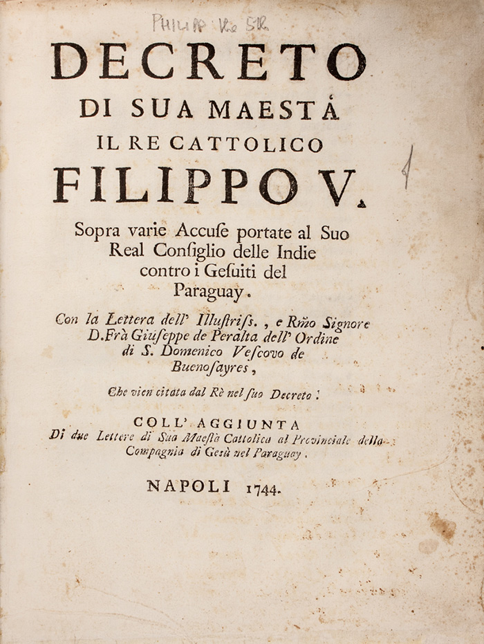 Filippo V - Re di Spagna, Decreto di sua Maestà il Re cattolico Filippo V sopra varie accuse portate al suo Real Consiglio delle Indie contro i Gesuiti del Paraguay.