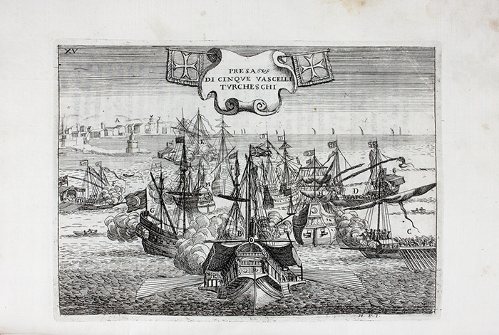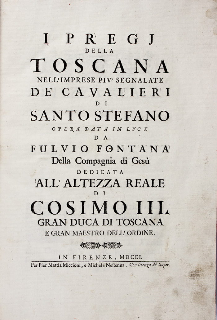 Edizione originale di questa celebrata e ricercata opera del Fontana sulle imprese militari dei Cavalieri di Santo Stefano, uno dei più bei figurati stampati a Firenze; le 37 belle incisioni realizzate da Hendrick Verschuring ripropongono i teatri di guerra delle più importanti battaglie navali combattute dalla flotta toscana contro i turchi, come quelle presso Algeri e Namur. Cfr. Atabey, 441; Choix, 13976; Graesse II, 611; Moreni I, 385: «Sonovi molte figure in rame [...] Evvi in principio una breve notizia della Città di Pisa [...] e di Livorno [...] mentre nel suo porto prendeano l'imbarco i Cavalieri dell'Ordine, ogni mossa dei quali era un corso di vittoria in vittoria»; Sommervogel III, 849; Piantanida 578.