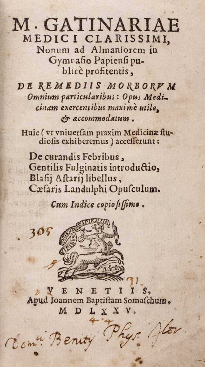 In-12° (mm 120x75). Pagine 735, [1]. Frontespizio con marca incisa in legno. Macchie e fioriture più evidenti in principio. Strappo a pagina 27 con minima perdita di testo. Legatura successiva in piena pergamena floscia. Note manoscritte al frontespizio. SI AGGIUNGE: Nola Giovanni, Quod sedimentum sanorum, aegrorumque corporum non sit eiusdem speciei...Venetiis: [Nicolò Bevilacqua], 1562. In-4° (mm 195x150). Pagine [8], 82, [2]. Frontespizio con marca tipografica incisa in legno. Sporadiche macchie, ma buone condizioni. Legatura moderna in piena pelle. SI AGGIUNGE: Brasavola Antonio Musa, Examen omnium electuariorum, puluerum, et confectionum...Venetiis: ex officina Erasmiana Vincentii Valgrisii, 1548. In-8° (mm 170x100). Pagine 140, [4]. Lievi gore d'acqua e fioriture. Legatura coeva in piena pergamena floscia con abrasioni ai piatti. Numerose note manoscritte a margine del testo e al frontespizio. (3)