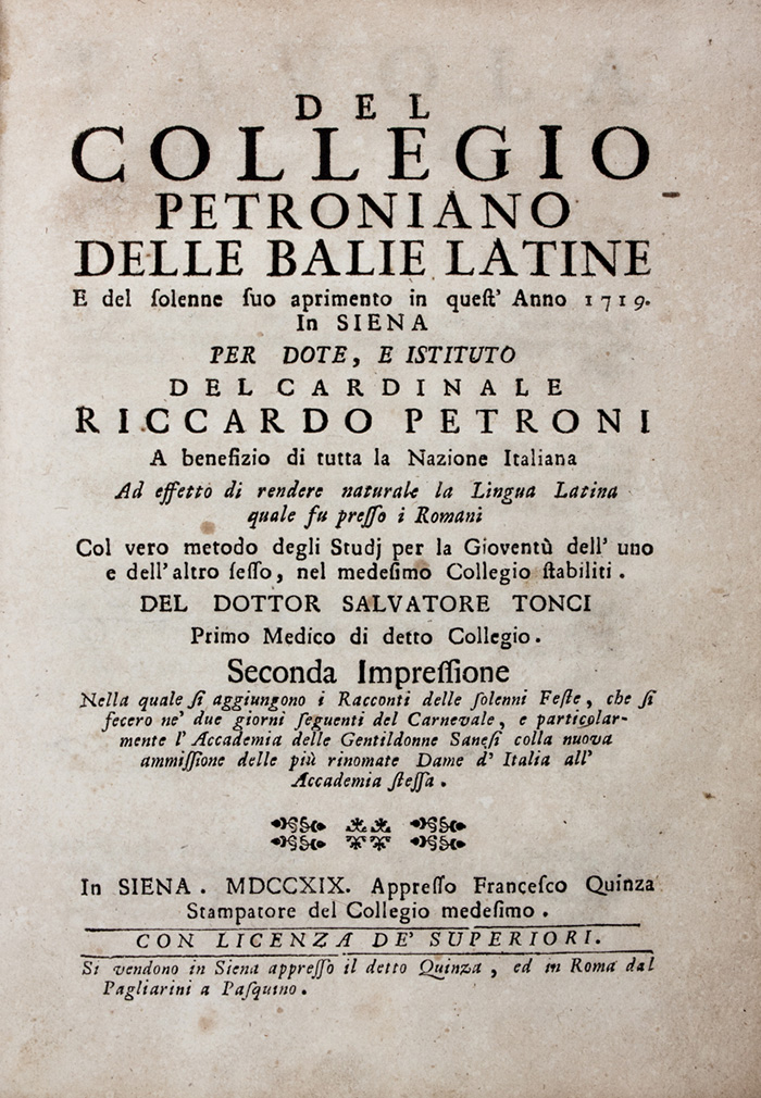 In Siena: appresso Francesco Quinza Stampatore del Collegio medesimo, 1719.
