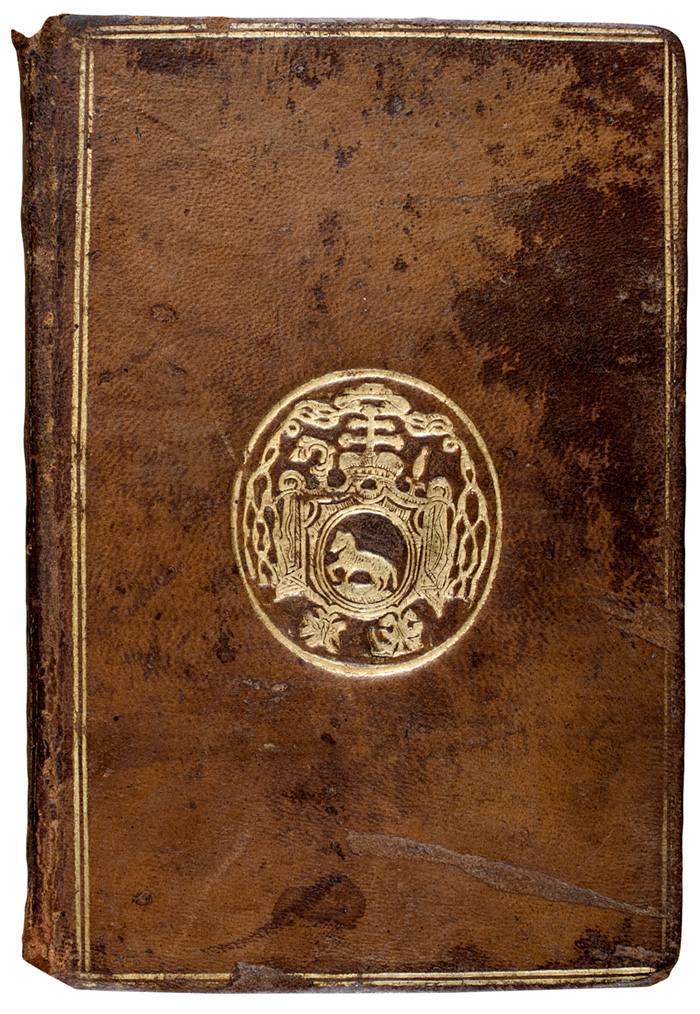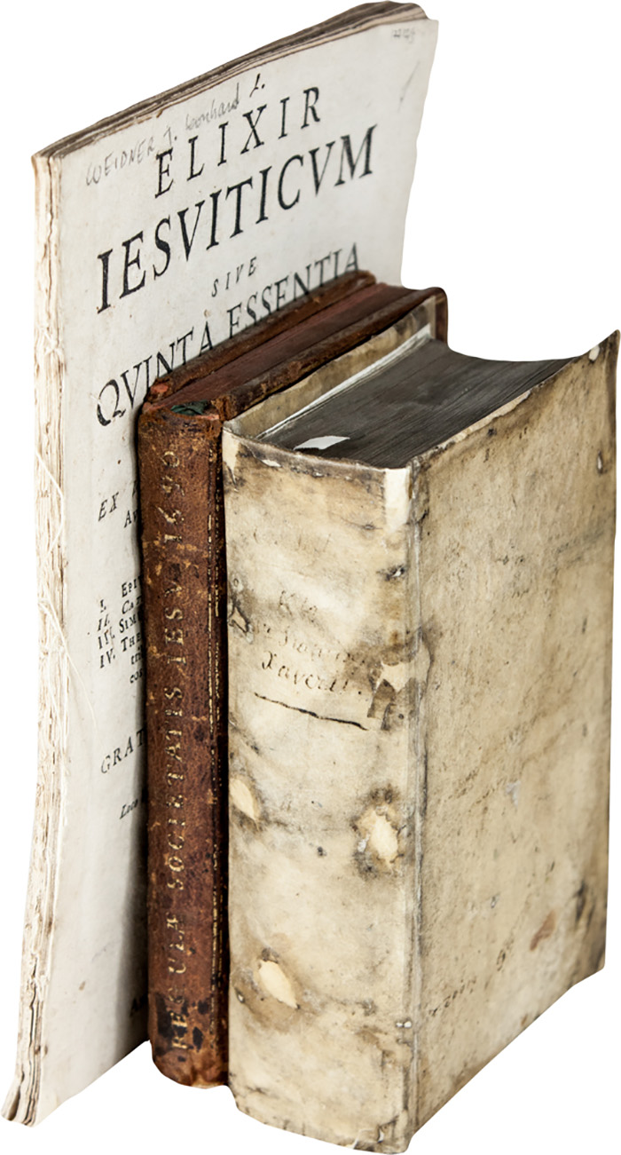 In-8° (mm 156x100). Pagine 230, [10] (bianche le ultime 3 carte). Grande stemma dei gesuiti al frontespizio e ornamenti tipografici al testo incisi in legno. Fioriture lievi, più evidenti in principio e in fine. Legatura coeva in pieno vitello alle armi cardinalizie, con difetti al dorso. SI AGGIUNGE: Torsellini Orazio, De vita Francisci Xaverii, qui primus è Societate Iesu in Indiam & Iaponicam Evangelium invenit libri sex. Antverpiae: Ex Officina Ioachimi Trognaesii, 1596. In-8° (mm 150x82). Pagine [14] (di 16), 605, [15]. Senza carta *8, bianca, con le carte finali dell'indice rifilate, forellini di tarlo nel testo da metà volume anche riparati, con minima perdita di lettere. Legatura coeva in pergamena con titoli manoscritti al dorso, restaurata. SI AGGIUNGE: Weidner Johann Leonhard, Elixir Iesuiticum sive Quinta essentia Iesuitarum [...] Collectore Gratiano Leosthene Saliceto. S.n.t. In-4° (mm 208x156). Pagine [4], 67, [1]. Esemplare slegato e con minime mende. (3)