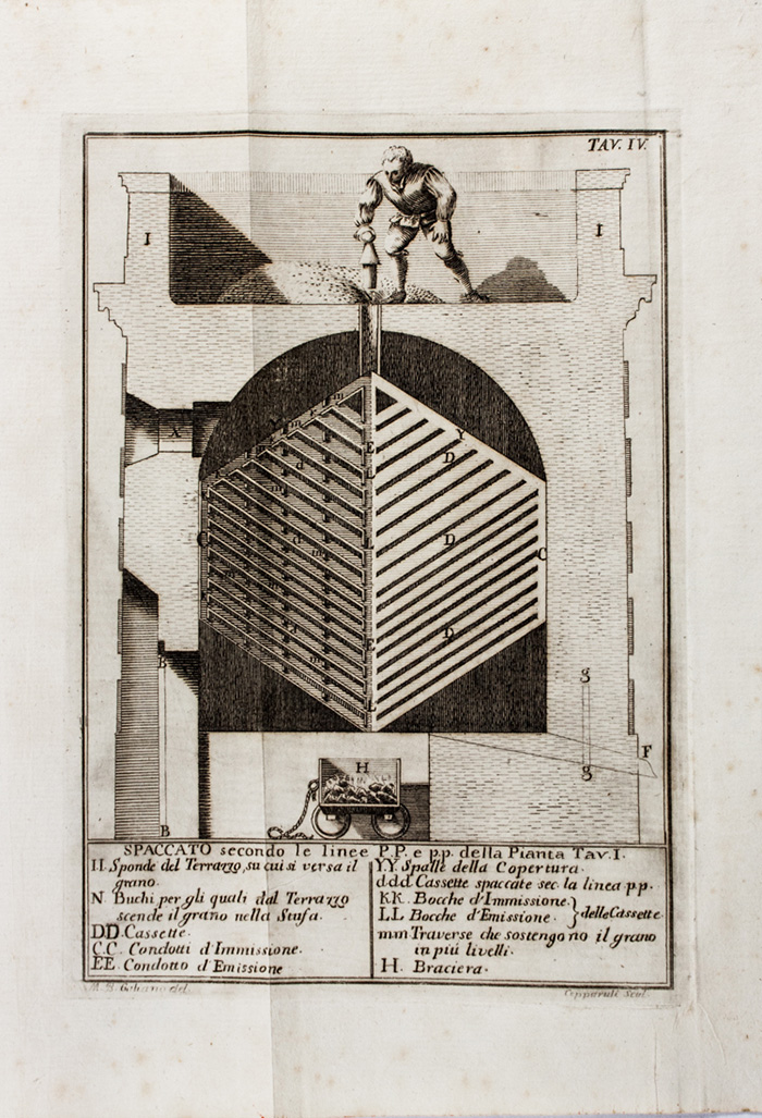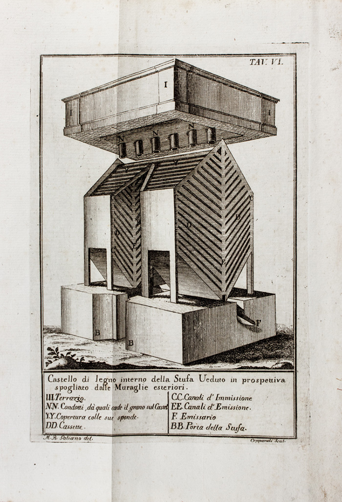 Prima rarissima edizione di questo importante saggio scritto dall'Agronomo fiorentino Intieri in collaborazione con Ferdinando Galiani, considerato da alcuni studiosi il vero autore dell'opera. Intieri, matematico e amministratore delle tenute campane dei Corsini e in seguito di quelle napoletane dei Medici e dei Rinuccini, formò la propria cultura economica a contatto con Galiani e Genovesi e si adoperò per migliorare le tecniche agricole nel Regno di Napoli. In tale ottica cercò un metodo per impedire il deterioramento dei cereali immagazzinati e «fu l'inventore della Stufa a fuoco per la conservazione del grano» (Lastri 69). In questo saggio, corredato da tavole incise da Francesco Cepparuli su disegni di Galiani, «si trovano riepilogati tutti gli espedienti proposti innanzi a lui» oltre alla descrizione della stufa con il quale disseccare il grano e distruggerne i germi. Einaudi 2342; Paleari-Henssler 1717; Niccoli 196; Re III, 73.