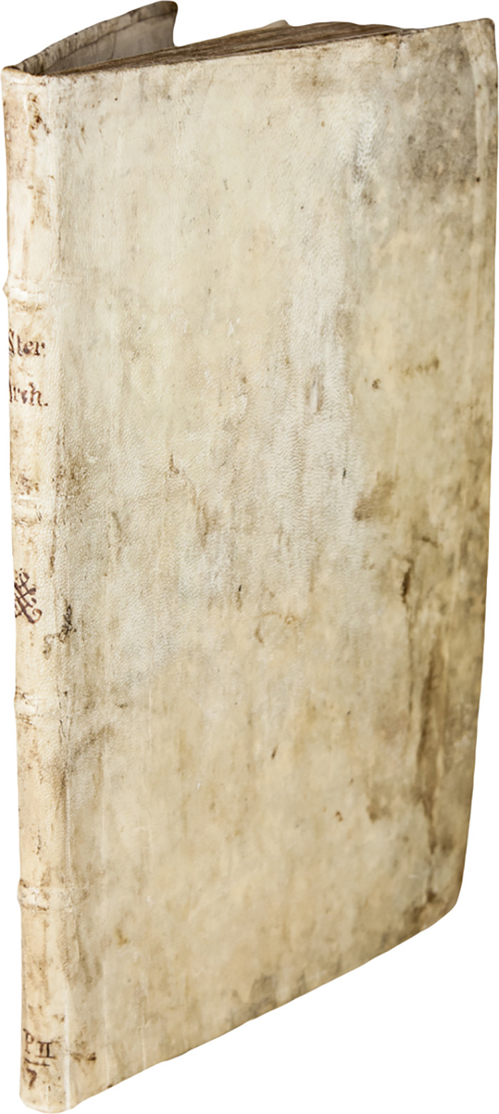 In-folio (mm 278x184). Carte [56] con l'errata presente ma applicata sul foglio di guardia e rifilata allo specchio di scrittura, come usuale. Con diagrammi e illustrazioni incisi in legno nel testo. Le carte G4-H1 mostrano evidenti segni di restauro e aloni di umidità, hanno strappetti riparati e la parte superiore del foglio ricostruita con alcune lettere restituite a penna. Poche carte precedenti e quelle successive sino alla fine del volume hanno nel medesimo margine superiore un restauro progressivamente più contenuto. Per il resto esemplare con le usuali lievi bruniture dovute alla carta del tempo. Legatura posteriore in piena pergamena con un taglio riparato lungo la cerniera posteriore, e altre minori mende.