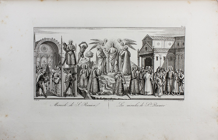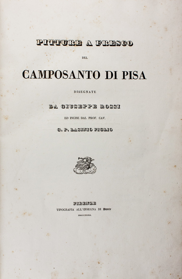 Le pitture murali del Cimitero monumentale pisano, che già nell'Ottocento versavano in gravi condizioni e, come è noto, dovettero subire un ulteriore affronto nel secolo successivo, ci sono state tramandate e testimoniate nella loro completezza da Carlo Lasinio con la celeberrima serie di incisioni pubblicata nel 1812. Nel 1832, divenuta l'opera già rarissima, il figlio Giovanni Paolo Lasinio pubblicò una nuova serie di incisioni su disegni di Giuseppe Rossi, dove inoltre sono compresi i frammenti che non si trovano nell'edizione precedente. Graesse IV, 14; Lichtenthal 214; Lozzi II, 3661.