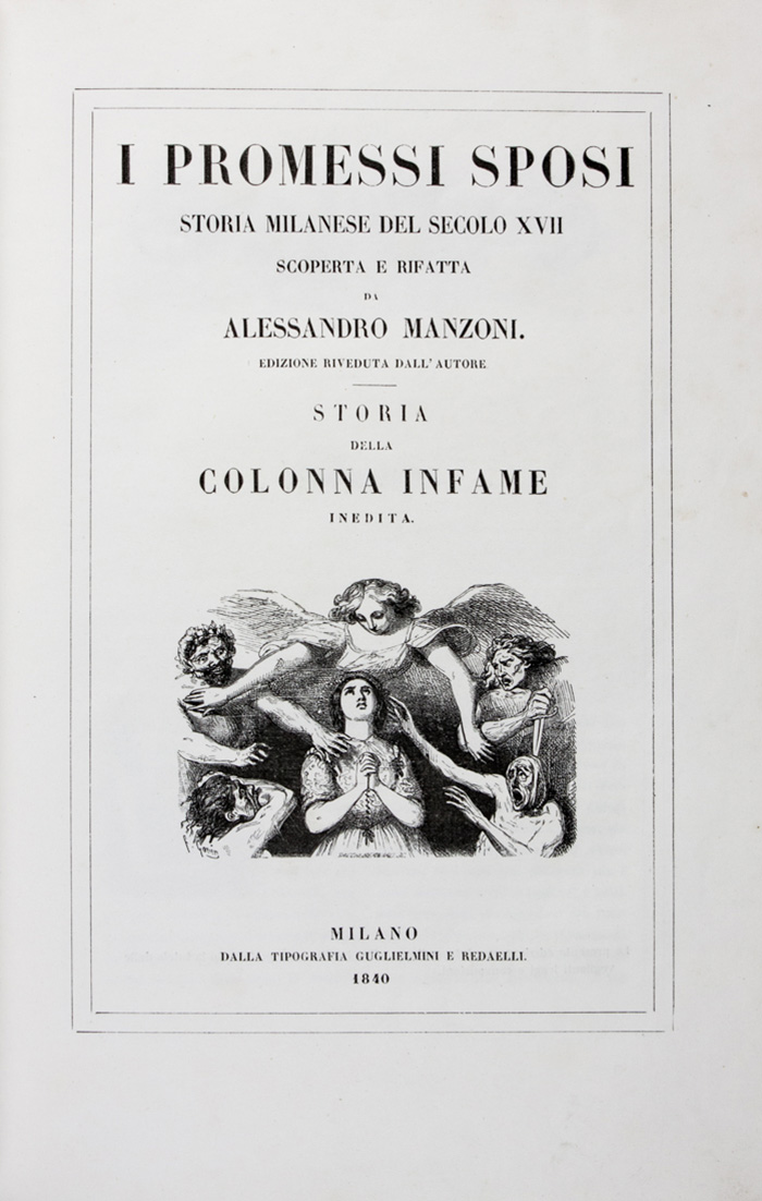 Ricercata prima edizione illustrata il cui testo è quello definitivamente stabilito dal Manzoni dopo la nota "risciacquatura in acqua d'Arno". Parenti 214-221; Parenti, Prime Edizioni, 331: «È la prima edizione del testo del romanzo riveduto e della Storia della Colonna Infame»; Vismara, 57: «E' curiosa! Mentre a Lugano, Torino [...] si fecero parecchie edizioni [...] a Milano ove si pubblicò la I° edizione [...] non se ne fece una seconda che nel 1840». La Quarantana non è solo l'edizione più corretta del testo dei Promessi Sposi; è anche la prima e unica edizione illustrata approvata dallo stesso Manzoni, che non solo la volle, ma partecipò attivamente alla realizzazione dell'impianto iconografico, costituito da disegni di Francesco Gonin, Luigi Bisi, Francesco Moja, Giuseppe Sogni, Luigi e Paolo Riccardi, Massimo d'Azeglio. Cfr. Tellini, Manzoni, 38: «Le vignette [...] sono tutte programmate da Manzoni, per quanto riguarda la scelta del tema da illustrare, il taglio, la sceneggiatura, la successione delle immagini».