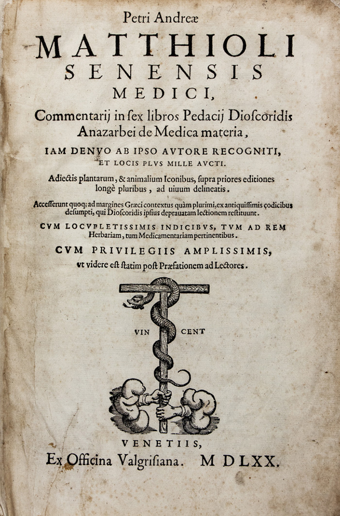Mattioli Pietro Andrea, Commentarii in sex libros Pedacii Dioscoridis Anazarbei de Medica materia [...] Adiectis plantarum, & animalium Iconibus, supra priores editiones longe pluribus...