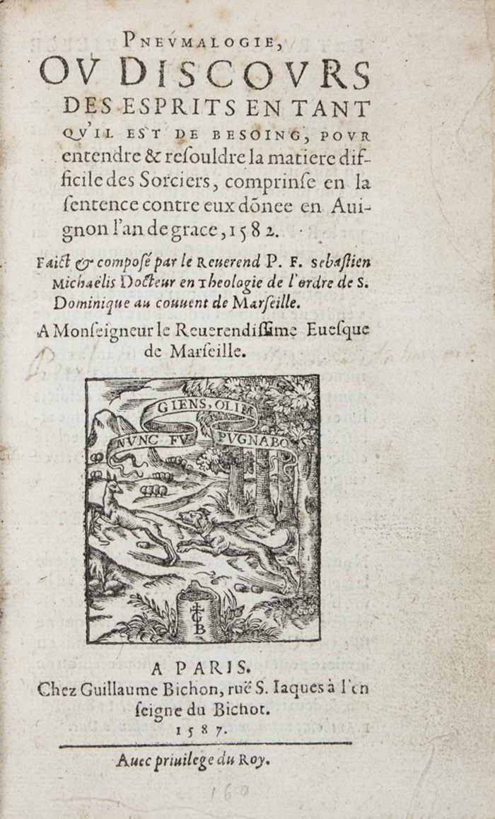 Michaelis Sébastien, Pneumalogie, ou Discours des esprits en tant qu'il est de besoing, pour entendre & resouldre la matiere difficile des Sorciers, comprinse en la sentence contre eux donne en Avignon l'an de grace 1582...