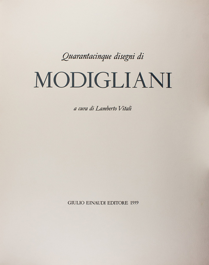 In-folio massimo (mm 560x450). Pagine [16] e 45 tavole sciolte di disegni riprodotti in fototipia di Modigliani. Esemplare numero 14/750 su una tiratura complessiva di 1000 copie. Cofanetto editoriale in tela con titoli al dorso e facsimile di firma al piatto.