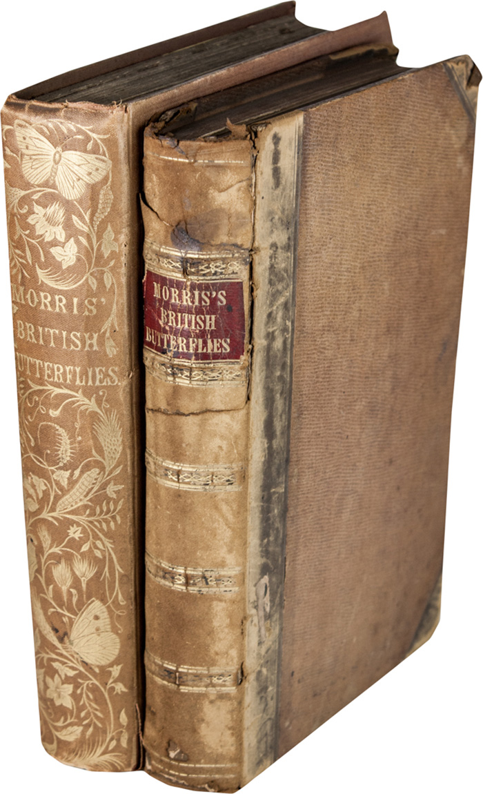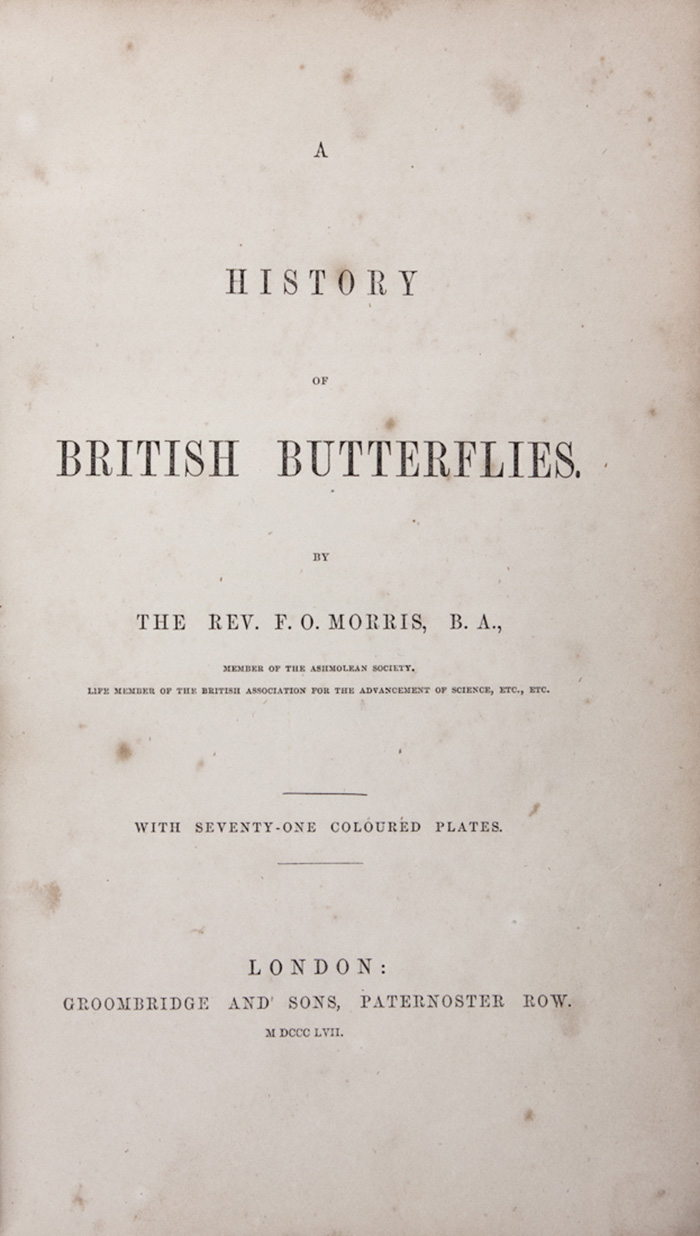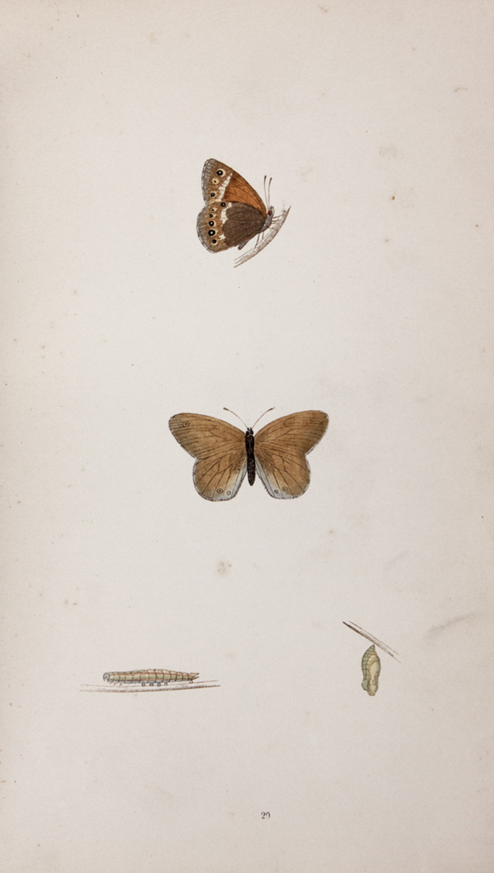 In-8° (mm 244x147). Pagine [2], VI, 14, 1-28, 15-168. Con 71 deliziose tavole a colori fuori testo raffiguranti le varie specie di farfalle e 1 tavola a doppia pagina incisa in nero con gli strumenti dell'entomologo per la cattura e la conservazione degli esemplari. Internamente bella copia, ma con un fascicolo centrale quasi del tutto slegato. Legatura coeva in mezza pelle con punte e piatti in tela, molto rovinata. SI AGGIUNGE: Id., A History of British Butterflies [...]. Fifth edition, with seventy-two coloured plates. London: George Bell & sons, 1870. (2)