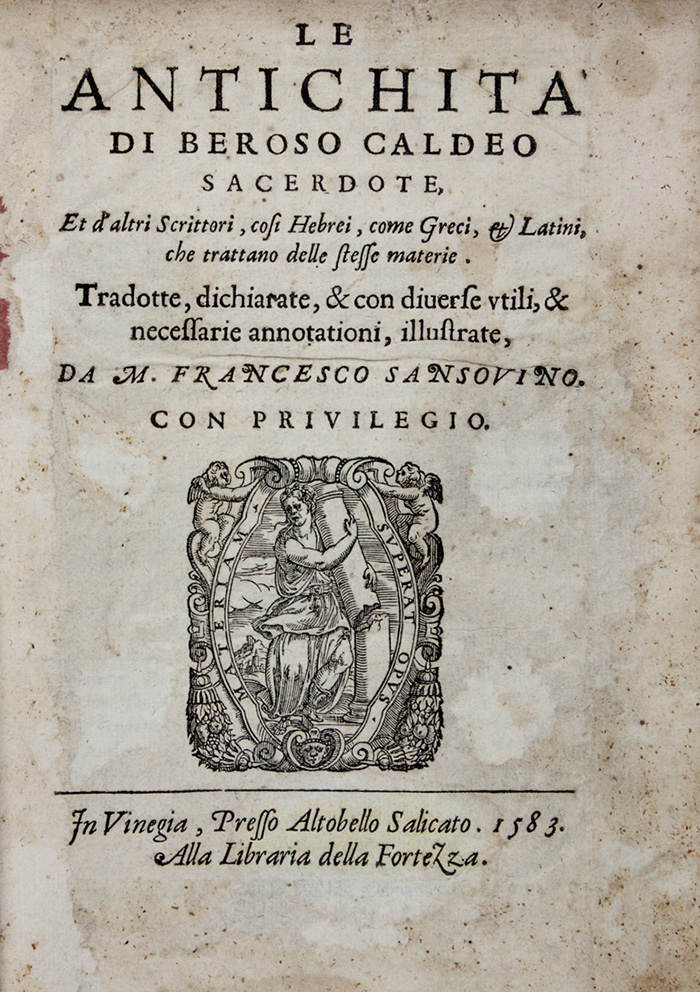 Prima edizione della traduzione del Sansovino. Gli Auctores vetustissimi di Giovanni Nanni, più noto come Annio da Viterbo, stampati per la prima volta a Roma nel 1498, ebbero un'enorme diffusione e influenza fino agli ultimi decenni del Cinquecento; cfr. L'officina del geografo 59-60: questa raccolta di frammenti attribuiti a scrittori greci e romani ma in realtà opera del Nanni conobbe più di venti edizioni fra la princeps e l'ultima del 1612, senza contare i volgarizzamenti. Fra questi, l'edizione allestita dal Sansovino viene considerata la migliore. Si veda Adams B-792; Biblioteca Degli Volgarizzatori I, 149; Melzi I, 127; Paitoni I, 173.