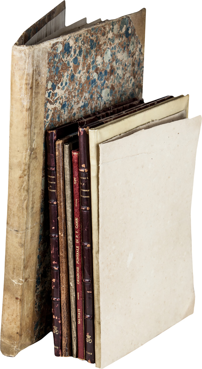 2 opere in 1 volume in-folio (mm 280x205). Pagine XLII, [1] con 1 tavola incisa in rame ripiegata. Gora d'acqua su tutta l'opera più evidente alla tavola incisa. LEGATO CON: Id., Orazione funebre in lode dell'Augustissimo Imperatore Francesco primo... In Firenze: nella stamperia di S. A. R., 1765. Pagine [2], 46, [2]. Lieve gora marginale. Legatura in mezza pergamena con punte e carta marmorizzata ai piatti. Segni di usura. SI AGGIUNGE: Rinieri Antonio, Copia dell'oratione recitata dalli ss. ambasciadori del Senato romano alla Creatione, & all'Altezza del serenissimo Don Ferdinando Medici... In Firenze: ad instantia di Francesco Dini, [s.d.]. Ex-libris Ginori-Conti al contropiatto. Monte Simoncelli Baldovino, Laudatio in funere Francisci Medicei... Florentiae: apud Donatum, & Bernardinum de Iunctis, & Socios, 1614. Cambi Pierfrancesco, Orazione funerale [...] delle lodi del Cavalier Lionardo Salviati... In Firenze: per Anton Padovani, 1590. Ex-libris Ginori-Conti al contropiatto. Mazzoni Jacopo, Oratio habita Florentiae VIII idus februarii anno 1688 in exequiis Catherinae Medicis... Florentiae: apud Philippum Iunctam, 1589 (due copie). Ex-libris Ginori-Conti al contropiatto di una delle due copie. Paganino Gaudenzio, Pianto [...] nella morte del Dottor Nicolo Aggiunti... In Pisa: Francesco Tanagli, 1635. Ex-libris Ginori-Conti al contropiatto. Accarisi Camillo, Oratio in Io. Iacobum Novarinum... Placentiae: Bazzachium, 1620. (8)