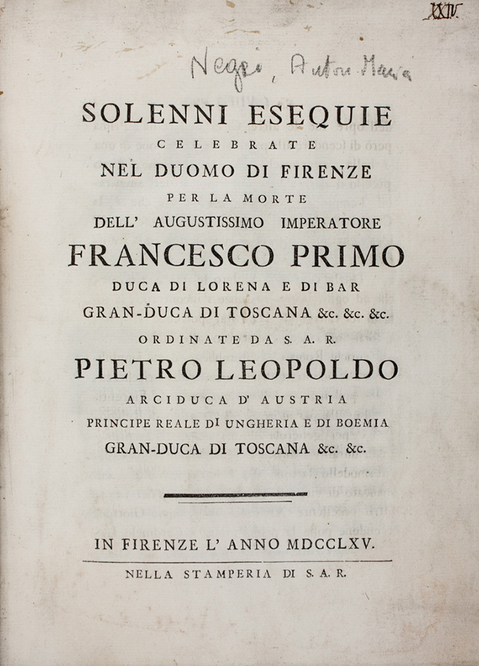 Negri Anton MariaSolenni esequie celebrate nel duomo di Firenze per la morte dell'Augustissimo imperatore Francesco Primo...