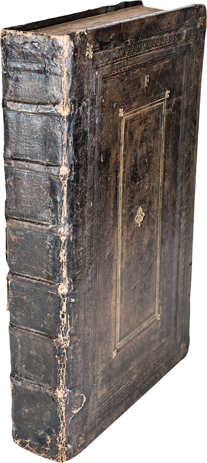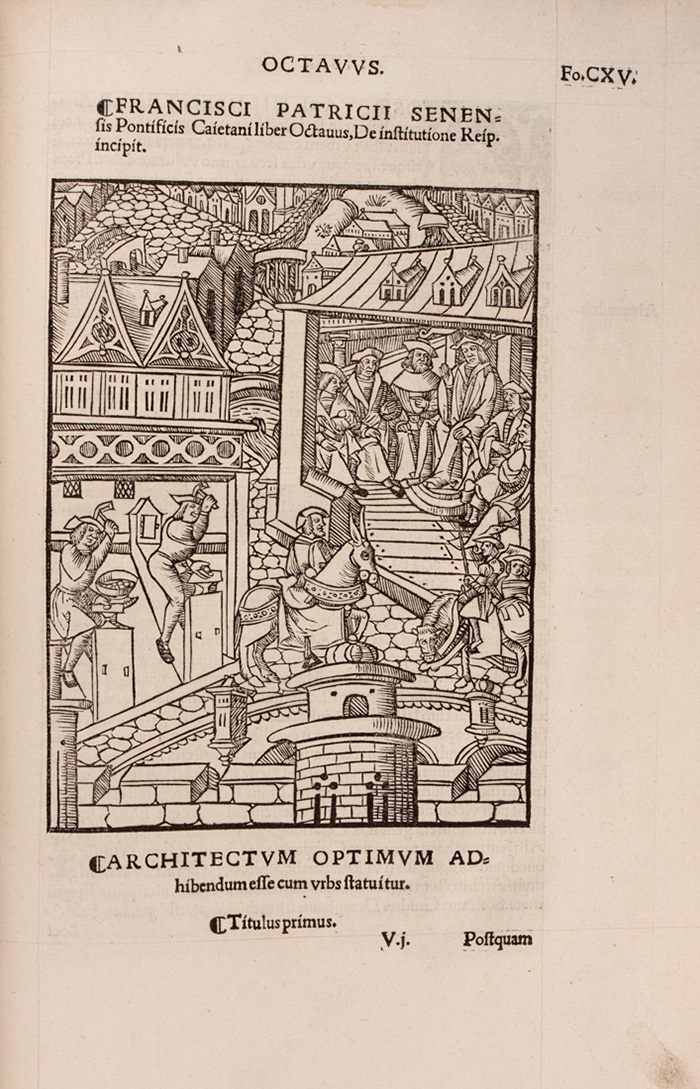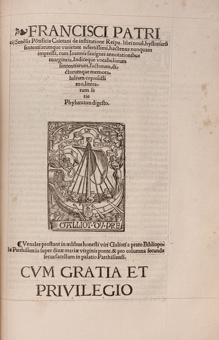 2 opere in 1 volume in-folio (mm 330x215). Pagine [44], CCCCVI, [2]. Frontespizio stampato in inchiostro rosso e nero entro bella bordura architettonica e al centro piccola marca dello stampatore, altra e più grande in fine, il tutto xilografico. Splendidi capilettera abitati da puttini o filigranati su sfondo nero. LEGATO CON: Id., De institutione Reipu. libri novem, historiarum sententiarumque varietate refertissimi... (Al colophon:) Parrhisiis: impraessorum opera [...] Petri Vidoue [...] impensis vero Galioti a Prado, 1520. Carte [16], CXLI. Grande marca dello stampatore al frontespizio e 9 belle illustrazioni incise in legno a piena pagina nel testo, di cui una con una piccola lacuna nell'inciso. Testo di entrambe le opere riquadrato in inchiostro rosso. Alcuni fascicoli lievemente bruniti ma ottimo esemplare ad ampi margini. Legatura coeva in pieno vitello maculato su assi di legno con plurime cornici concentriche a fregi fitomorfi e geometrici alternati a triplici filetti impresse a secco e in oro ai piatti, con ferri ai piccoli fiori impressi al centro e accantonati esterni, dorso muto a sei nervi; abrasioni e lacune ai piatti, difetti alle cerniere e restauri. Entro cofanetto in tela