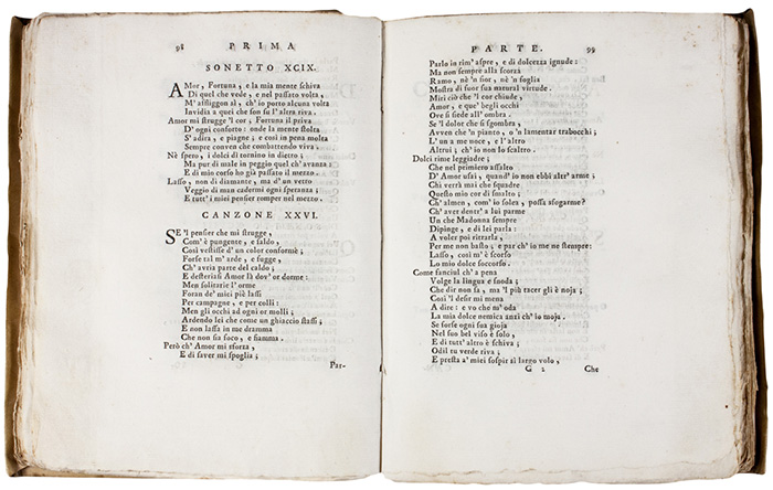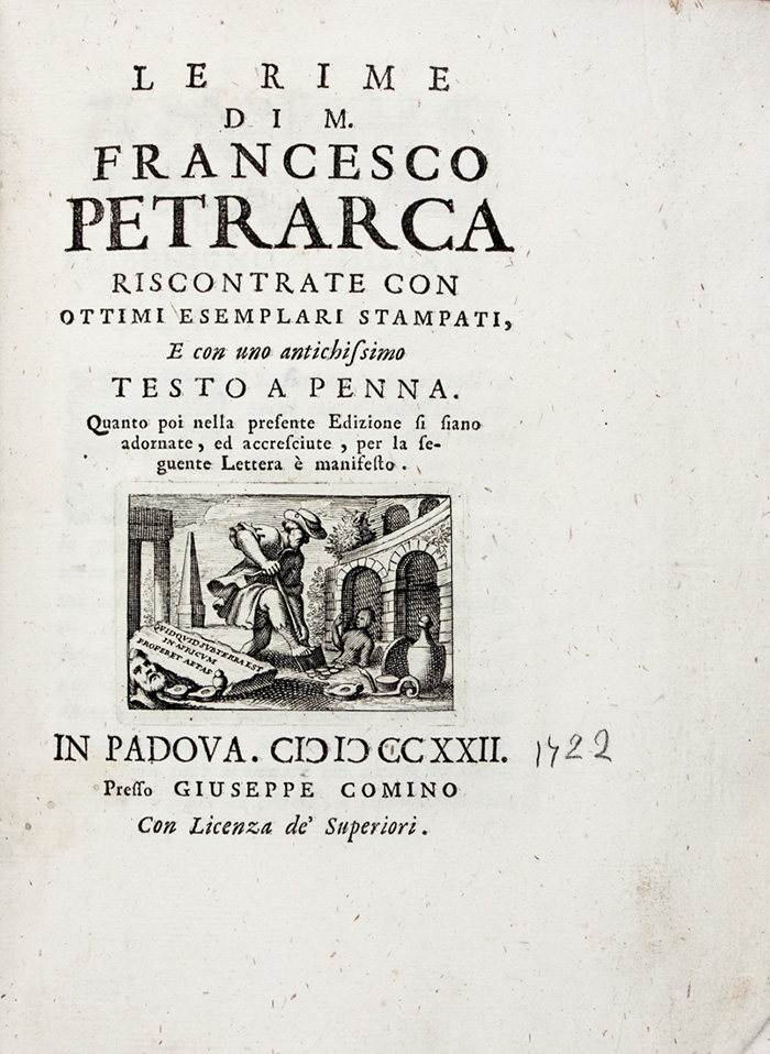 Pregevole e ricercata edizione del Canzoniere di Petrarca: «La nitidezza de' caratteri, la bellezza della carta e soprattutto la diligenza grandissima, con cui è stata fatta questa edizione [...] la rendono distinta e pregiata fra le edizioni del Canzoniere pubblicate nel secolo XVIII» (Marsand 99). Questa edizione fu celebratissima anche per il testo e fu citata dagli Accademici della Crusca nel loro vocabolario, «non facendo uso che di questa sola edizione nelle citazioni della Frottola», una delle poesie «che si dicono da lui rifiutate» e inserite nella presente opera. Si vedano anche Brunet IV 554; Fondo Petrarchesco della Trivulziana 6; Gamba 730; Petrarchesca Rossettiana di Trieste 159.