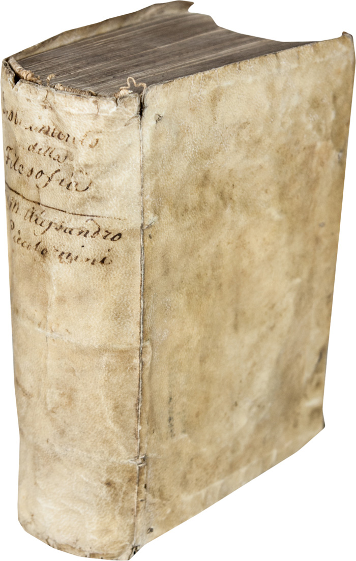 2 opere in 1 volume in-8° (mm 148x100). Carte 147, [5] (l'ultima bianca). Marca dello stampatore e piccola vignetta allegorica al frontespizio. LEGATO CON: Id., [Della filosofia naturale. Parte prima (-seconda)]. In Venetia: per Francesco Lorenzini, 1560. 2 parti, mancanti dei frontespizi. Legatura coeva in pergamena floscia con risvolti e lacerti di legacci.