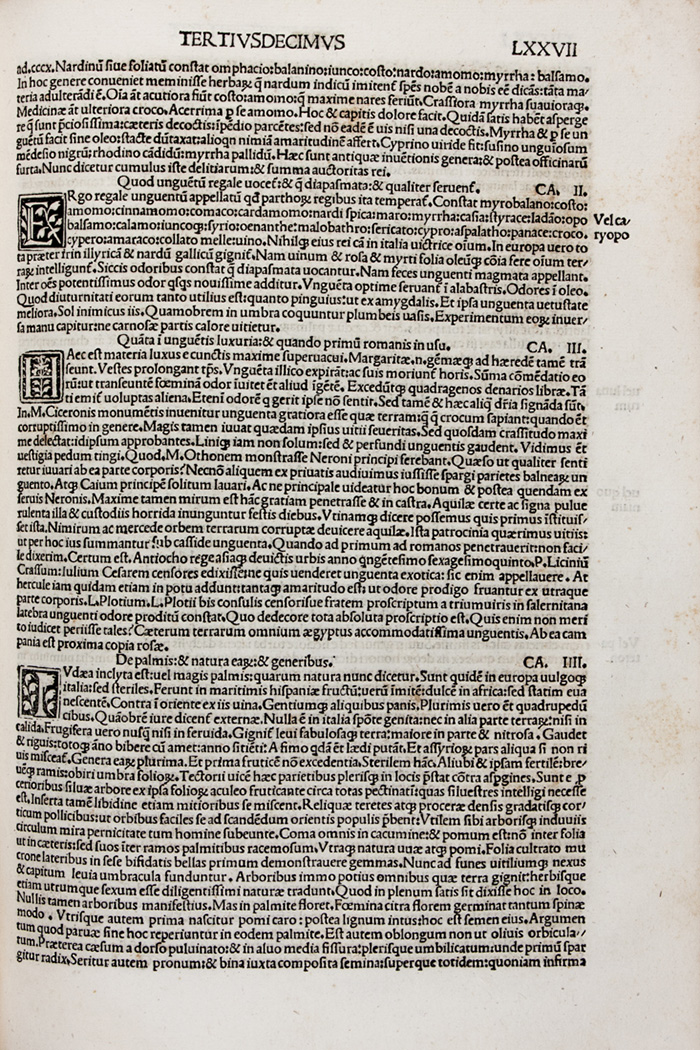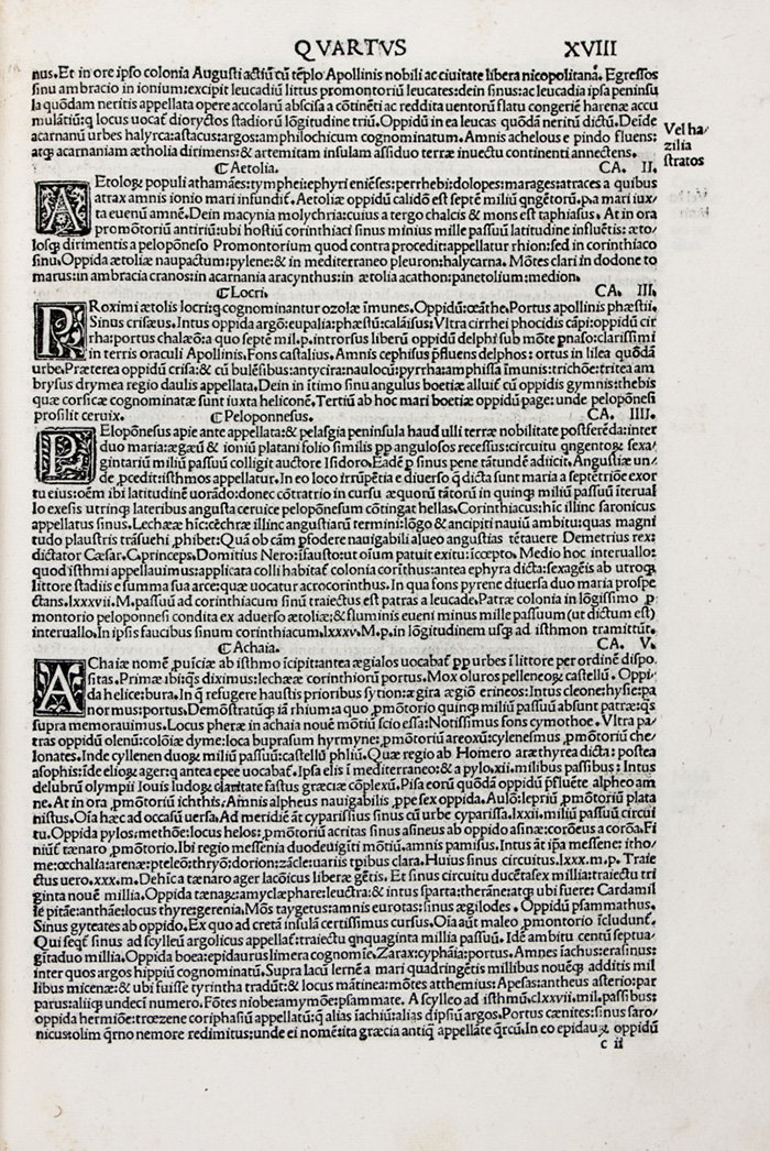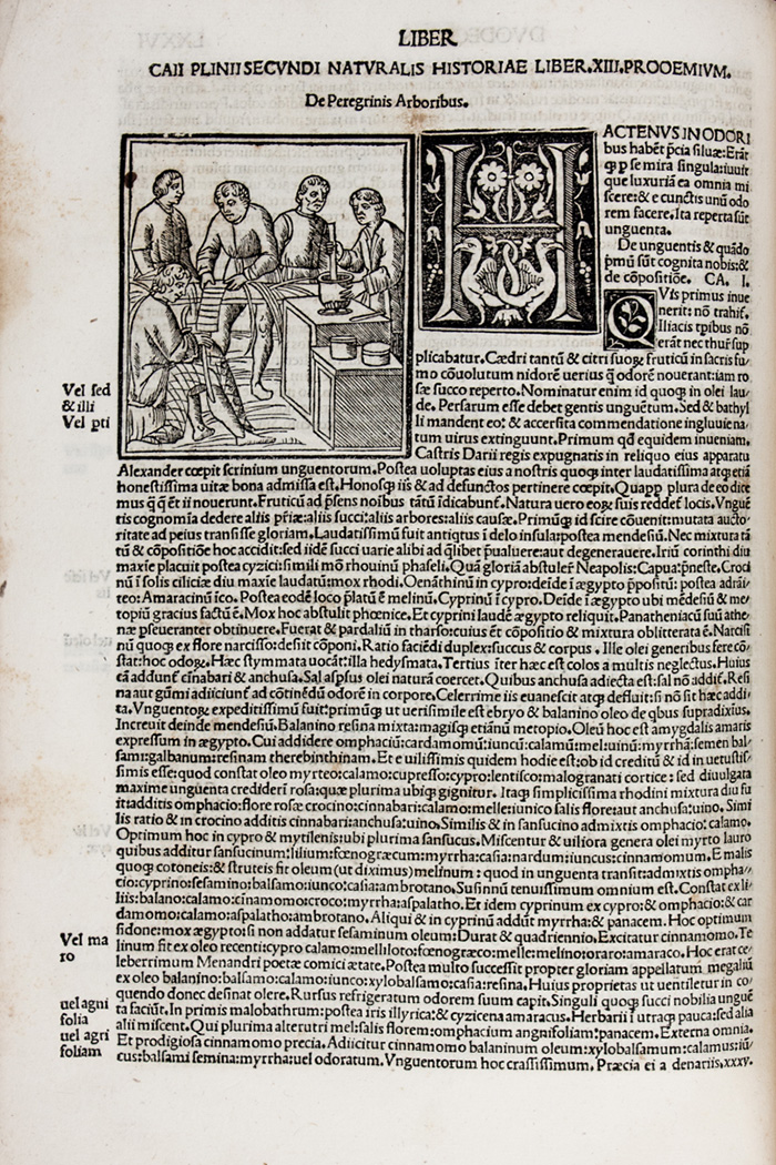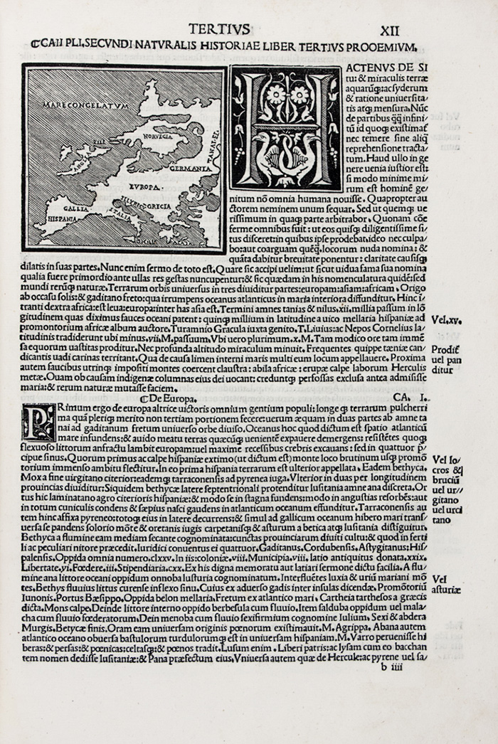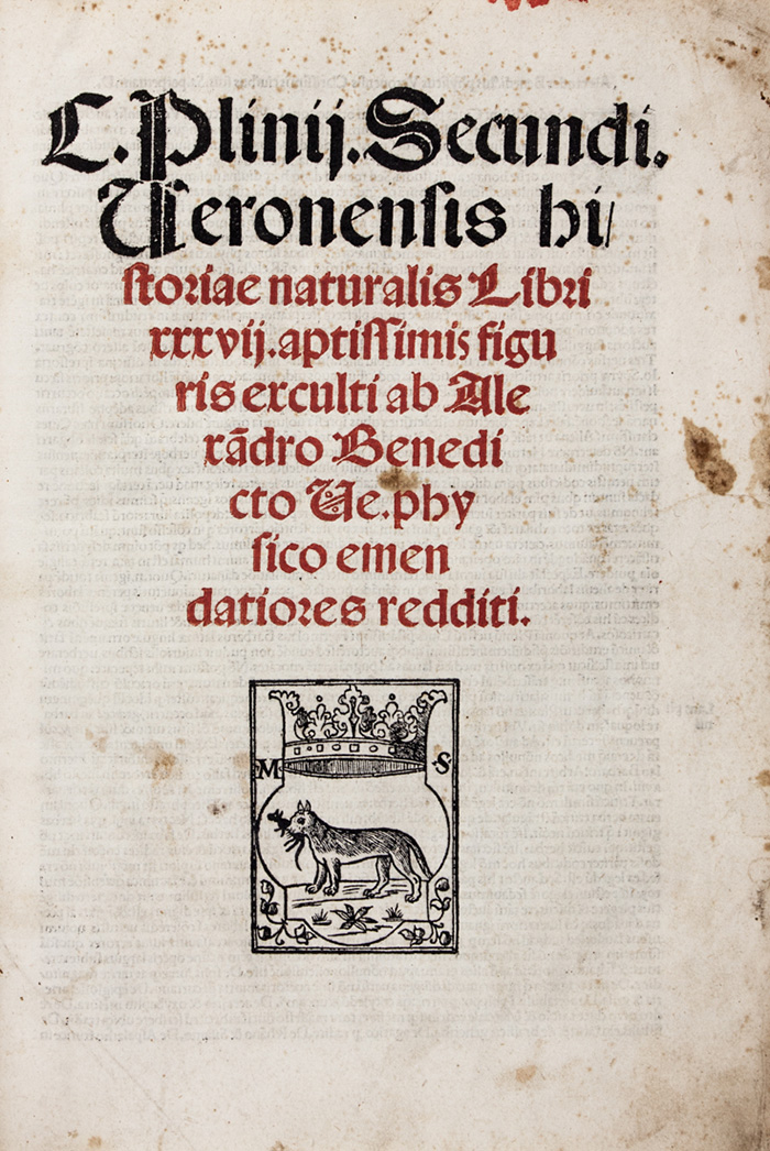 Prima rara edizione illustrata di Plinio. Per questa edizione il Sessa commissionò 38 splendidi legni di 74x81 mm circa ciascuno, fra i quali si menzionano 3 carte geografiche (Europa, Africa e America), un ritratto di Plinio seduto nell'atto di scrivere e la formazione della Terra, solo per citarne alcune. Cfr. Essling 4; Sander 5760; Schweiger II, 785. Manca ad Adams.