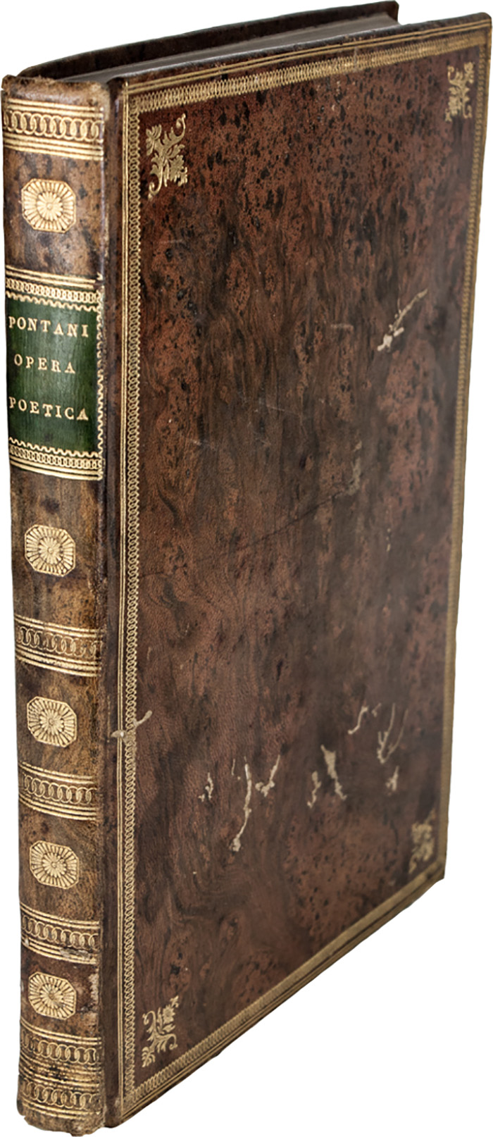 In-folio (mm 278x188). Carte [148]. Lacune reintegrate al margine e strappi nel testo con perdite trascurabili nelle prime due carte, aloni di umidità e tracce di muffa alle prime 16 carte circa, aloni marginali più lievi e contenuti nelle carte successive, forellini e lavori di tarlo sempre lontani dal testo lungo il volume. Legatura settecentesca in piena pelle maculata con cornici di filetti e fregi geometrici impresse in oro ai piatti con piccoli ferri floreali accantonati interni, decori ai comparti e titoli dorati su tassello al dorso. Esili lavori di tarlo al piatto anteriore. Lunga annotazione al foglio di guardia e nota di posseso siadita al frontespizio, di mano settecentesca.