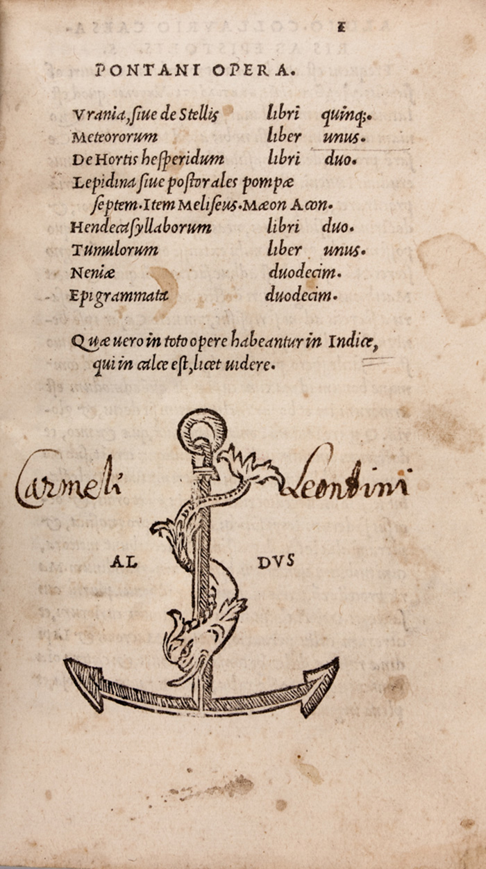2 opere in 1 volume in-8° (mm 153x92). Carte 255, [1]. Ancora aldina incisa in legno al frontespizio e ripetuta al colophon, spazi per capilettera con letterine-guida. LEGATO CON: Id., Amorum libri II. De amore coniugali III. Tumulorum II... S.n.t (forse Venezia, dopo il 30 dicembre 1522). Carte 171, perduta l'ultima bianca. Tracce di sporco alla prima carta e leggeri aloni di umidità marginali ma ottima copia. Legatura seicentesca in piena pergamena rigida con unghiature, laccetti conservati, titoli impressi in oro su tassello al dorso; stanche le cerniere, sguardie rinnovate. Nota di possesso Carmeli Lentini manoscritta al frontespizio della prima opera