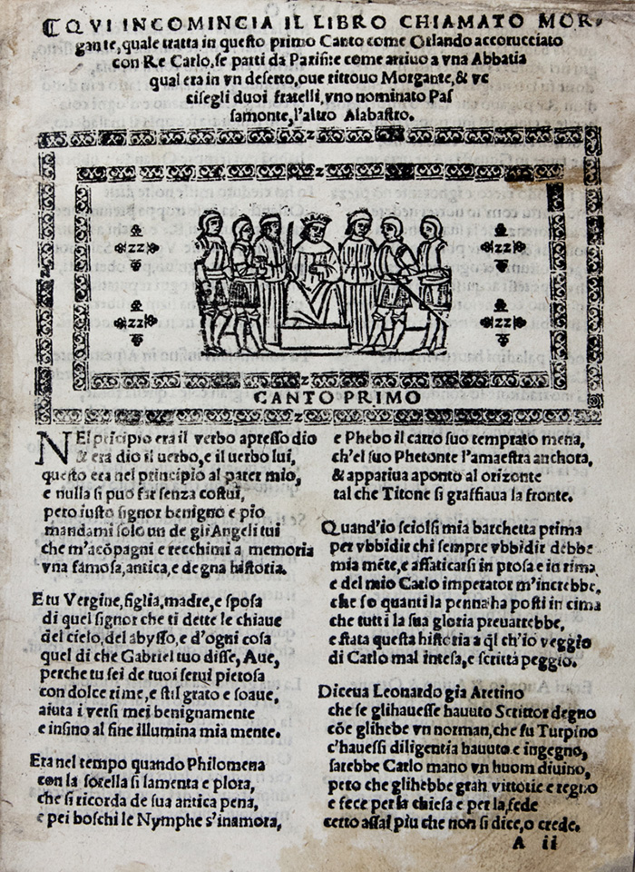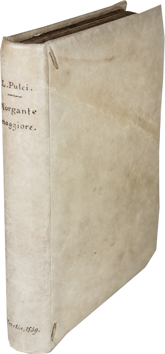 Rarissima edizione del Morgante, di cui si conoscono solo 2 copie nelle biblioteche italiane, una nel fondo Castiglione della Braidense e l'altra nella Palatina di Firenze. Di questo celebre poema, dalla genesi e dalla vita editoriale complessa, furono fatte moltissime edizioni, ma pochissime copie rimangono di quelle precedenti al 1545 e nessuna della princeps; prima del 1537, con eccezione dell’edizione veneziana del 1507 documentata in 7 esemplari, nessuna edizione supera la soglia di quattro copie sopravvissute. La bella vignetta xilografica raffigurante Morgante e Margutte è ripresa dall'edizione Bindoni e Pasini del 1525 (Essling I.2, 773) mentre i 91 graziosi legni che ornano il testo compaiono qui per la prima volta. Cfr. Melzi, Romanzi e poemi cavallereschi italiani 490; Harris, Sopravvivenze e scomparse delle testimonianze del Morgante.