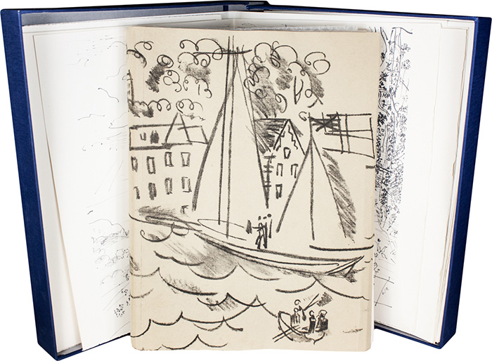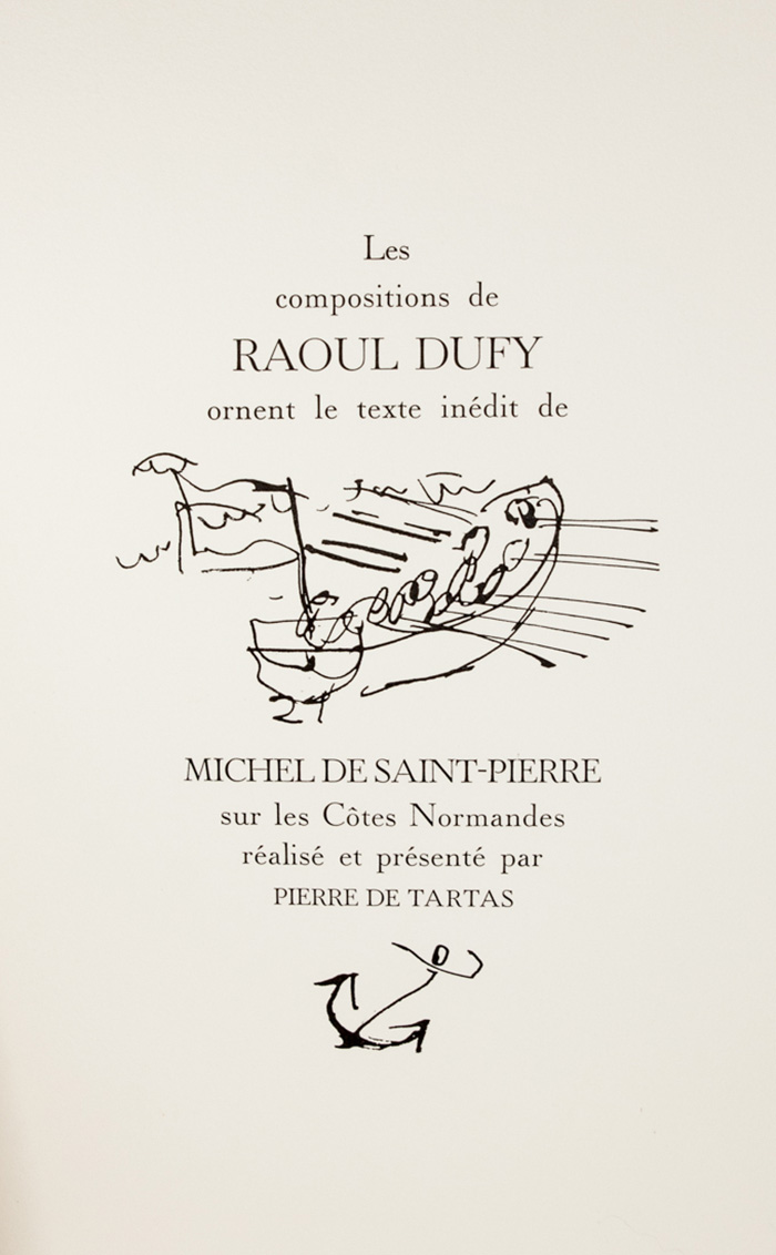 In-4° (mm 375x275). Pagine 114, [14] a fascicoli sciolti, con 25 litografie di Dufy protette da veline, di cui 6 a colori (5 a doppia pagina e 1 a piena pagina) e 17 in nero (9 a doppia pagina, 3 a pagina singola e 7 nel testo). Esemplare n. 61 su una tiratura complessiva a 305 copie, uno dei 50 su grand papier vélin d'Arches contenente «une décomposition des couleurs d'une planche» e una suite delle doppie tavole in nero su vélin de Rives, più 2 tavole rifiutate su vélin d'Arches. Firma dell'Artista a matita al colophon. A fascicoli sciolti entro cartella editoriale figurata, conservata in cofanetto editoriale.