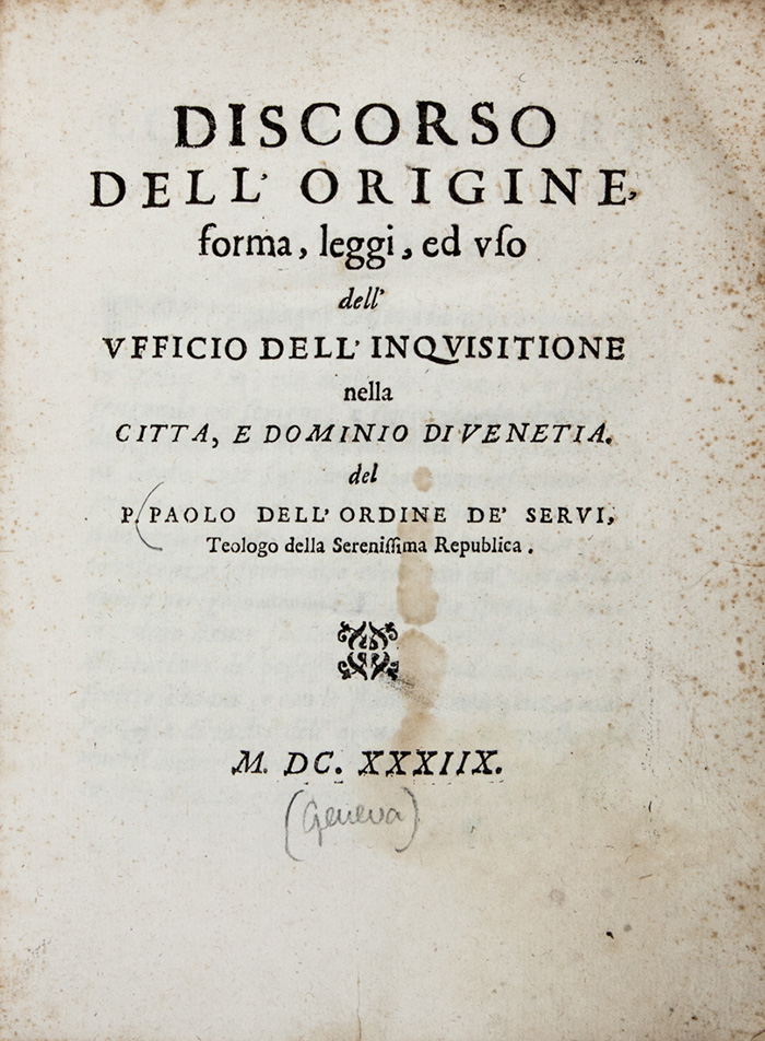 Sarpi Paolo, Discorso dell'origine, forma, leggi ed uso dell'Ufficio dell'Inquisitione nella città e dominio di Venetia.
