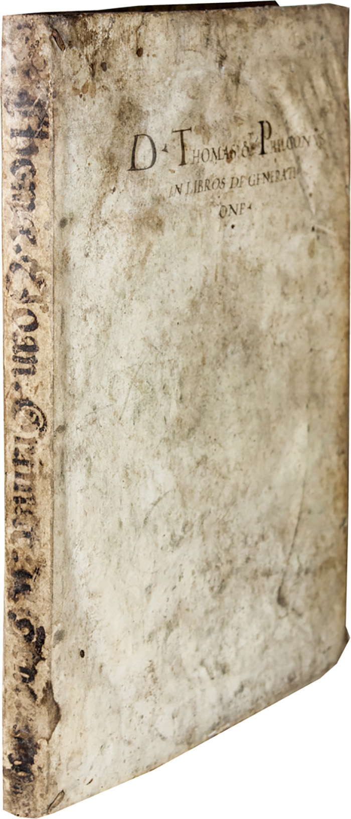 2 opere in 1 volume in-folio piccolo (mm 305x210). Carte [4], 37. Frontespizio con grande marca tipografica incisa in legno. Capilettera xilografati. Qualche fioritura e minime gore d'acqua, ma nel complesso ottimo stato di conservazione. Alcune note manoscritte e sottolineature al testo. UNITO A: Ioannes Philoponus, De generatione et corruptione Aristotelis: ex colloquiis Ammonii Hermeae...Venetiis: apud Hieronymum Scotum, 1559. Pagine [2], 137, [1]. Grande marca incisa in legno al frontespizio e al colophon. Alcune macchie e gore d'acqua marginali e al colophon, ma ottime condizioni generali. Lavoro di tarlo alle ultime due carte. Legatura coeva in piena pergamena floscia con titoli al piatto e al dorso. Piatti e dorso lisi e piccolo lavoro di tarlo al piatto posteriore. Ex-libris manoscritti al foglio di guardia anteriore.
