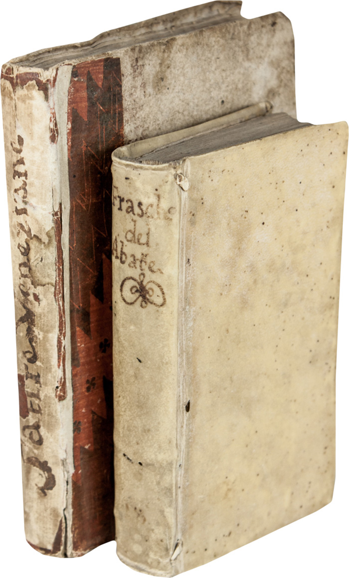 In-8° (mm 160x110). Pagine [14], 183, [19]. Antiporta inciso in rame con strappo marginale e lavoro di tarlo. Lavoro di tarlo anche al frontespizio. Capilettera e finalini incisi in legno. Lavoro di tarlo che non coinvolge il testo da pagina 21 a pagina 46. Copia leggermente allentata con fioriture sparse. Legatura coeva in cartonato con applicata striscia di carta decorata ai piatti. Titoli manoscritti al dorso con qualche mancanza. Ex-libris applicato al contropiatto anteriore. SI AGGIUNGE: Abati Antonio, Delle frascherie di Antonio Abati fasci tre. Francfort [i.e. Venezia]: per li heredi Sardani, 1673. In-12° (mm 135x70). Pagine 280, [8]. Gora d'acqua al margine superiore ai primi fascicoli. Piccolo forellino di tarlo all'occhietto, frontespizio e prima carta. Qualche carta un po' brunita, ma buone condizioni. Legatura in piena pergamena rigida con titoli manoscritti al dorso. Forellini di tarlo al dorso e al piatto anteriore. (2)
