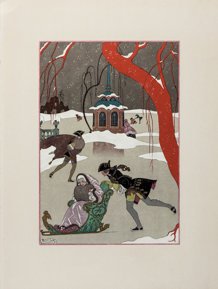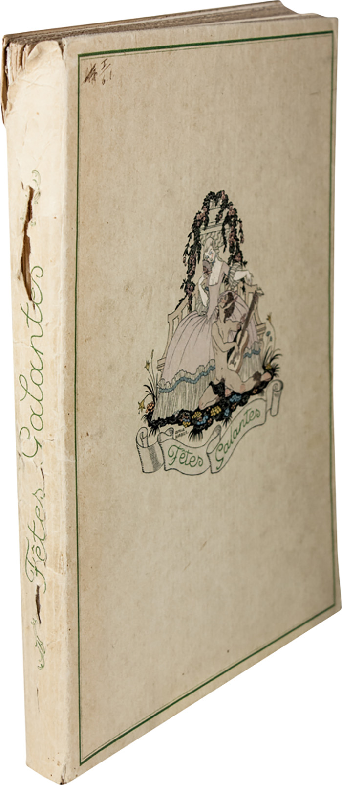 In-4° (mm 302x232). Pagine [4], 100, [4] con 1 frontespizio figurato a colori e 20 splendide tavole di Barbier fuori testo colorate au pochoir con rialzi in oro e argento, protette da velina. Esemplare n. 461, uno degli 800 su papier vélin pur fil de Rives, su una tiratura complessiva a 1200 copie. Prime ed ultime carte quasi del tutto slegate e molte altre allentate ma esemplare ben completo. Brossura editoriale illustrata, con due graziosi pochoir ai piatti sempre di Barbier e titoli impressi in verde al dorso, allentato e con strappi.