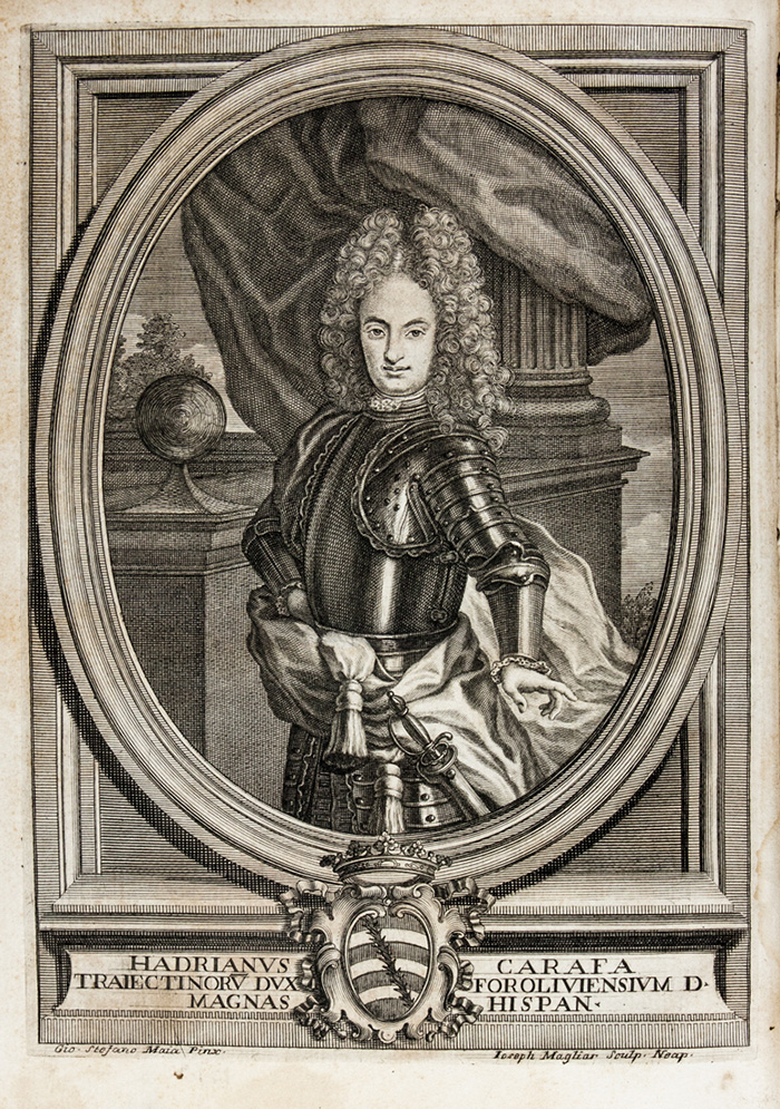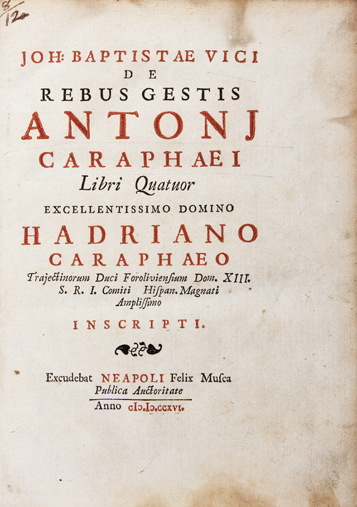 Prima edizione stampata in soli 1000 esemplari «parte venduta e parte donata, s'esaurì in una quindicina d'anni» (Croce-Niccolini I, 77-79). Vico scrisse questa imponente biografia del Carafa per incarico del nipote Adriano Antonio, suo allievo.