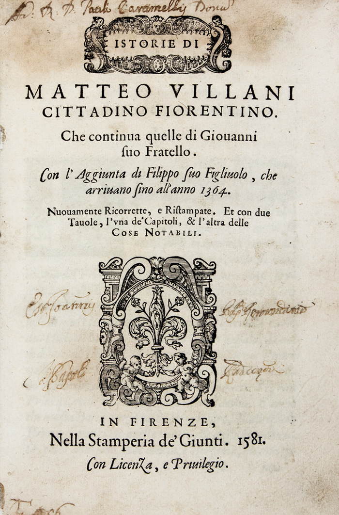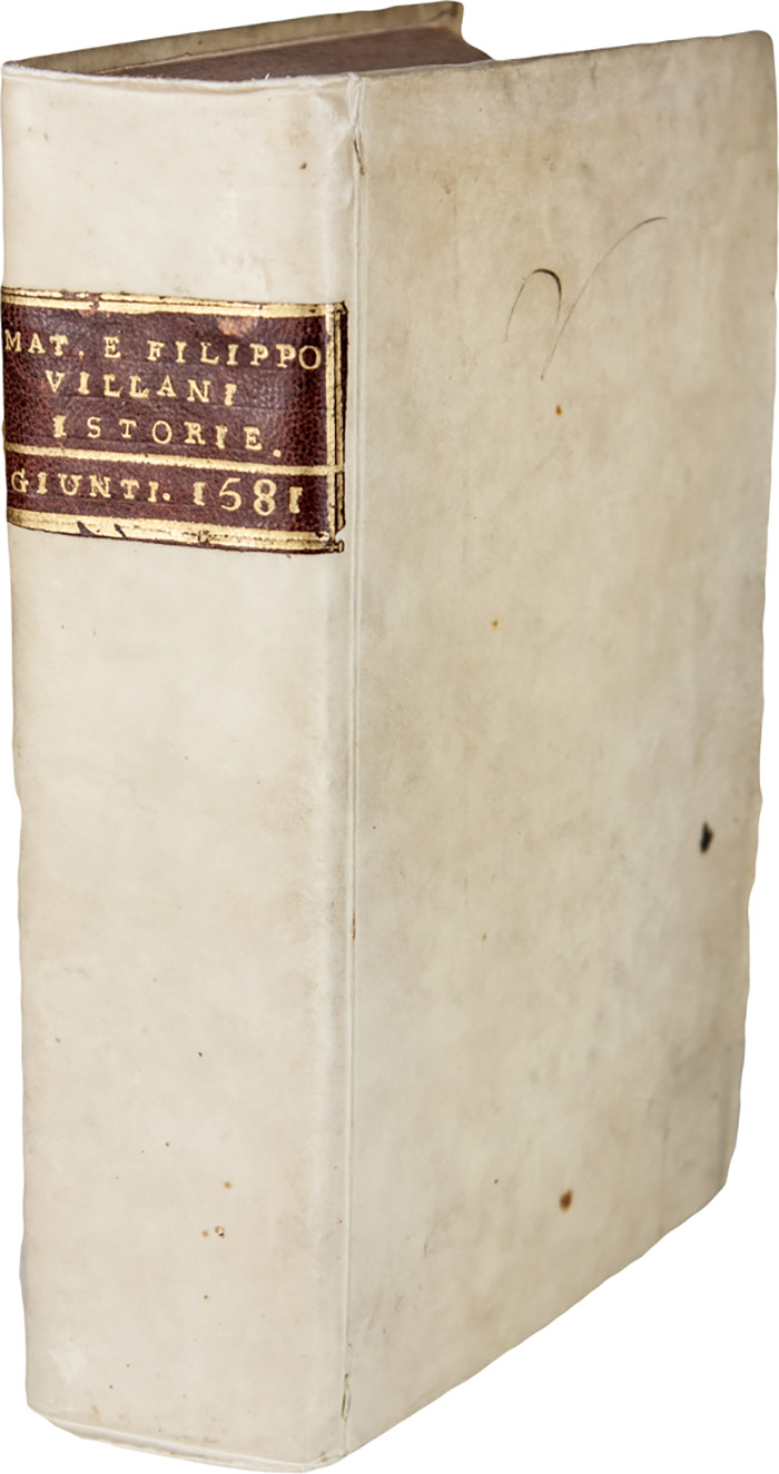 In-4° (mm 215x150). Pagine [32], 560, [22]. Marca giuntina al frontespizio, ripetuta in fine; testatine, capilettera e finalini xilografici. Numerosi errori di numerazione, fioriture e bruniture sparse e a tratti marcate ma buona copia. LEGATO CON: Id., Della historia di Matteo Villani [...]. Li tre ultimi libri. In Firenze: Nella stamperia de' Giunti, 1596. Pagine [16], 190 [i.e. 194], [14]. Marca giuntina al frontespizio, ripetuta in fine; testatine, capilettera e finalini xilografici. Legatura settecentesca in piena pergamena rigida con titoli impressi in oro su tassello al dorso. Nota di possesso manoscritta al frontespizio.