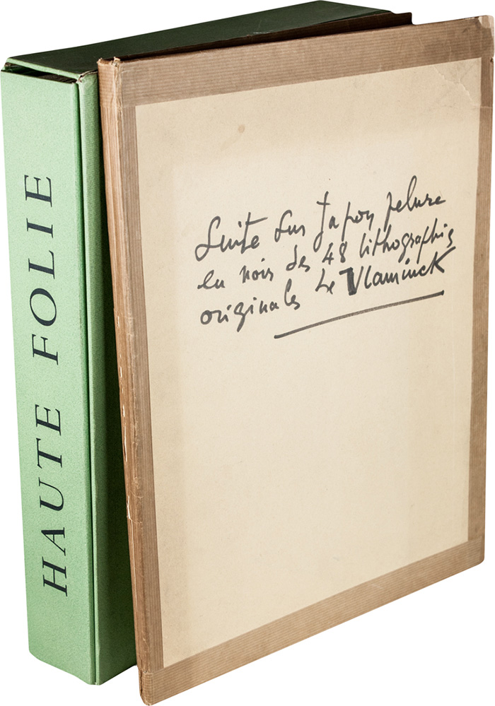 In-4° grande (mm 304x280). Pagine 154, [6] con 48 litografie originali a colori a 3/4 di pagina di Vlaminck, di cui una in antiporta, e di 40 capilettera a colori di Paul Bonet. Ottima copia. Esemplare n. 28 su una tiratura complessiva a 260 copie su vélin d'Arches, più poche copie non numerate destinate ai maggiori collaboratori tirate su Japon nacré, e con due suites delle illustrazioni, in nero e a colori. Brossura, astuccio e custodia editoriali, la custodia con difetti. Il nostro esemplare è impreziosito da una suite su Japon pelure in nero delle 48 litografie entro cartella editoriale e astuccio in cartonato; a penna è indicato esemplare n. XXV. (2)