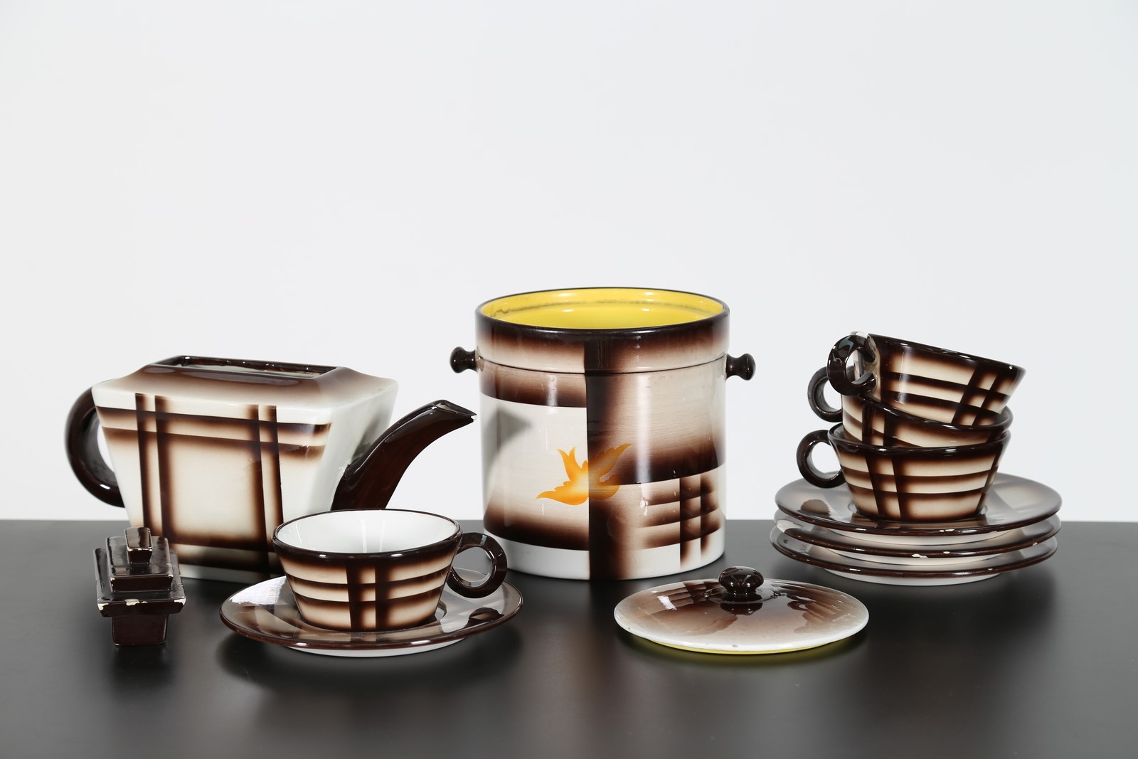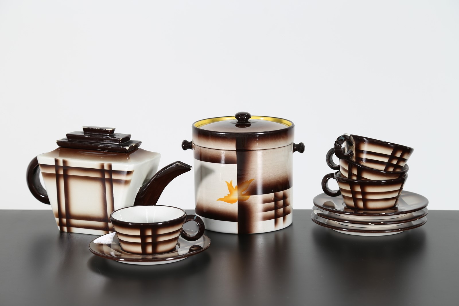 GALVANI ANDREA Servizio in ceramica con decoro all'aerografo. Galvani Pordenone anni 30. . -. . Marchio presente. Piccole scheggiature. Misura: biscottiera 16 x 16 x 16, teiera 14,5 x 25 x 8,5, piattino 1,5 x 16 x 16, tazzina 4,5 x 12 x 8,