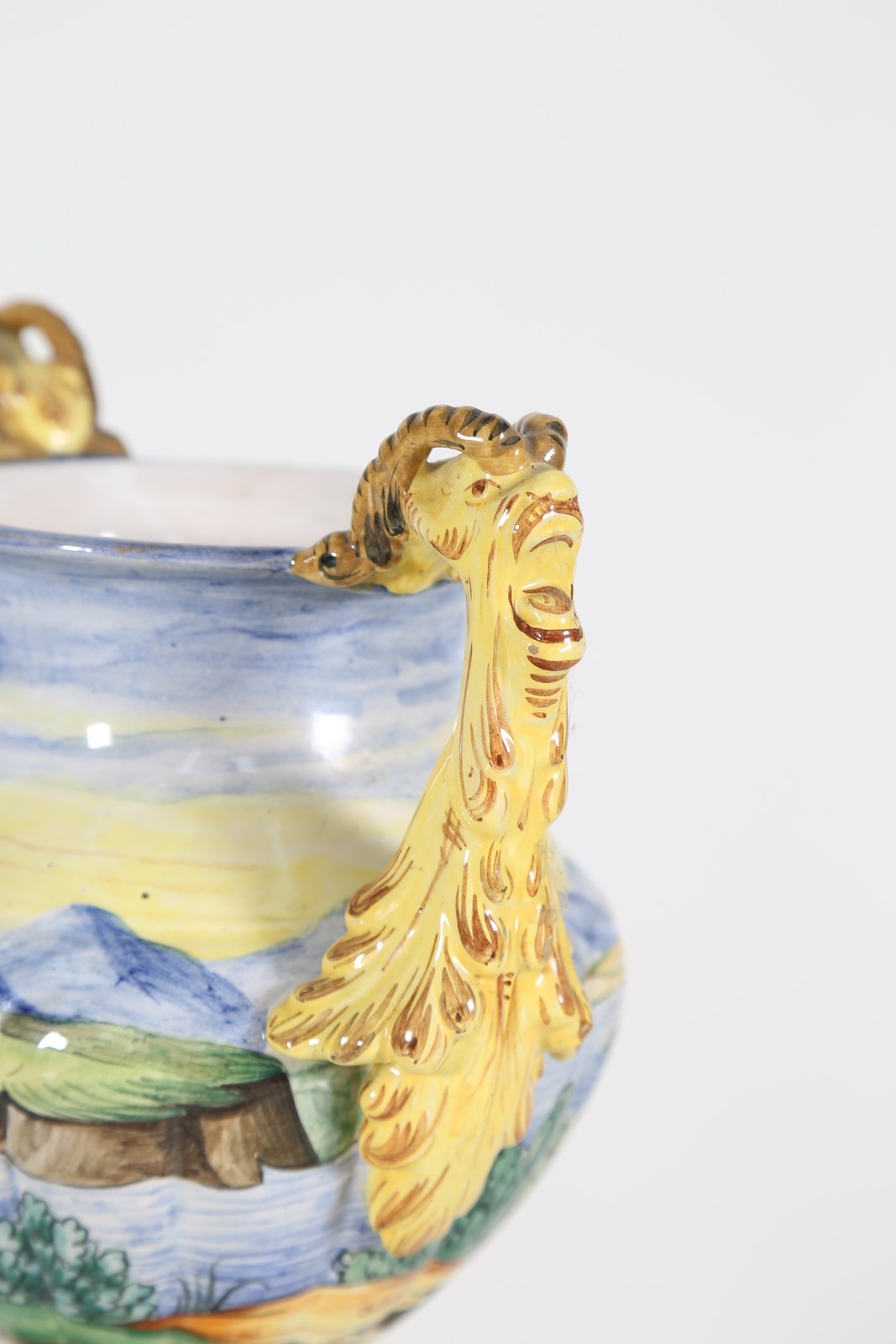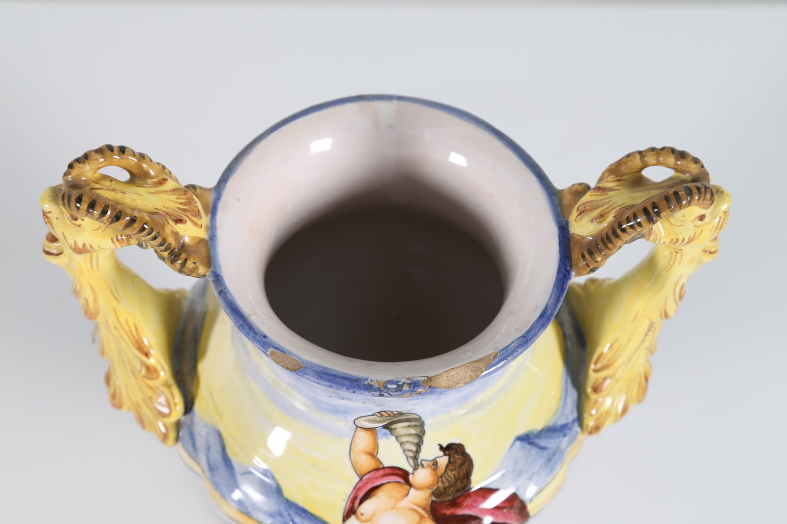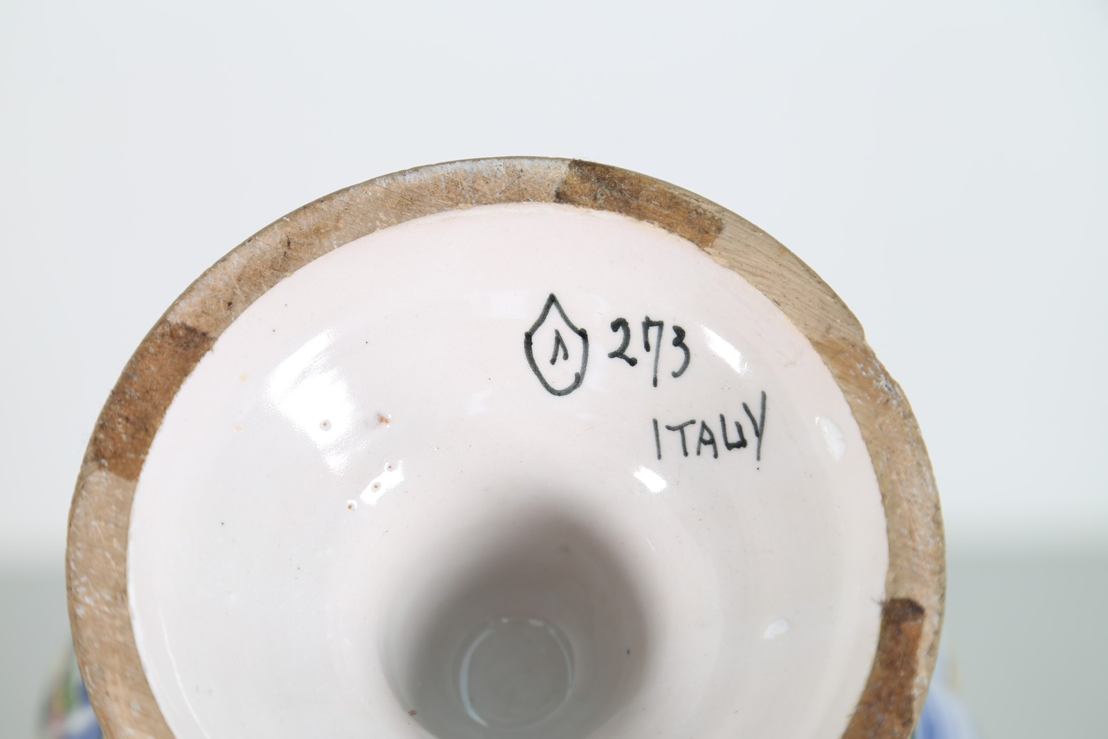 FANTECHI Vaso in ceramica decorata con anse e coperchio. -. Cm 25,00 x 28,00 x 20,00. Marchio presente. Piccole scheggiature.