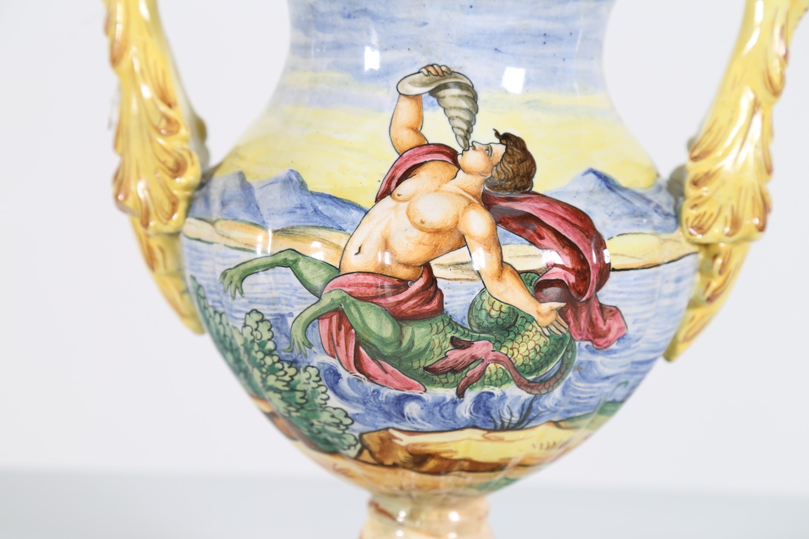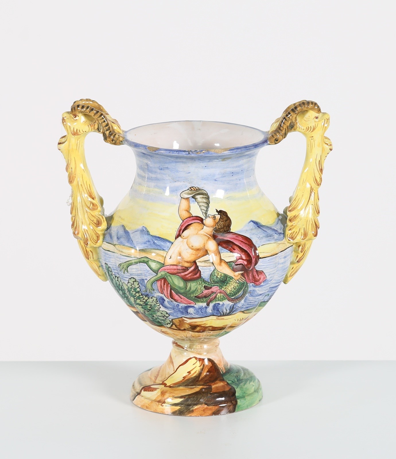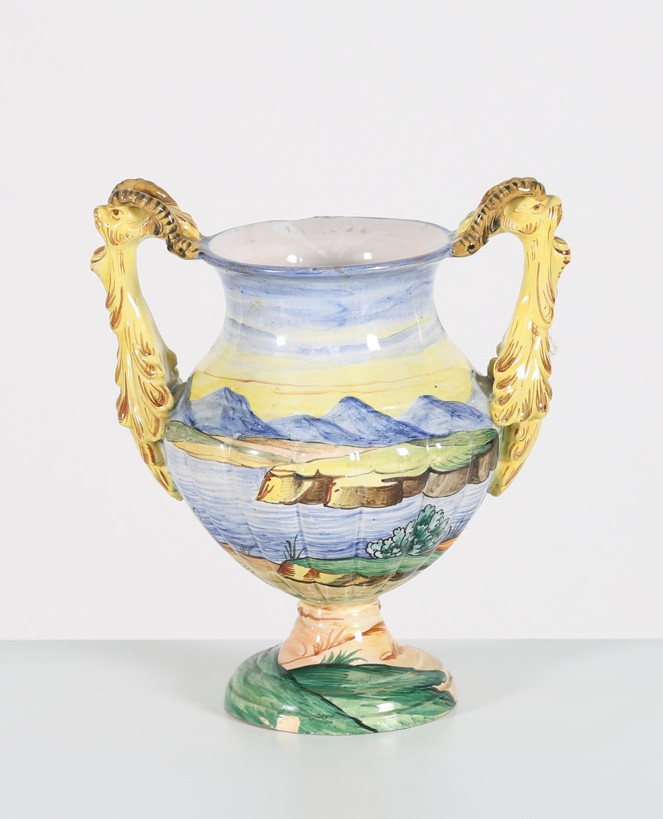 FANTECHI Vaso in ceramica decorata con anse e coperchio. -. Cm 25,00 x 28,00 x 20,00. Marchio presente. Piccole scheggiature.