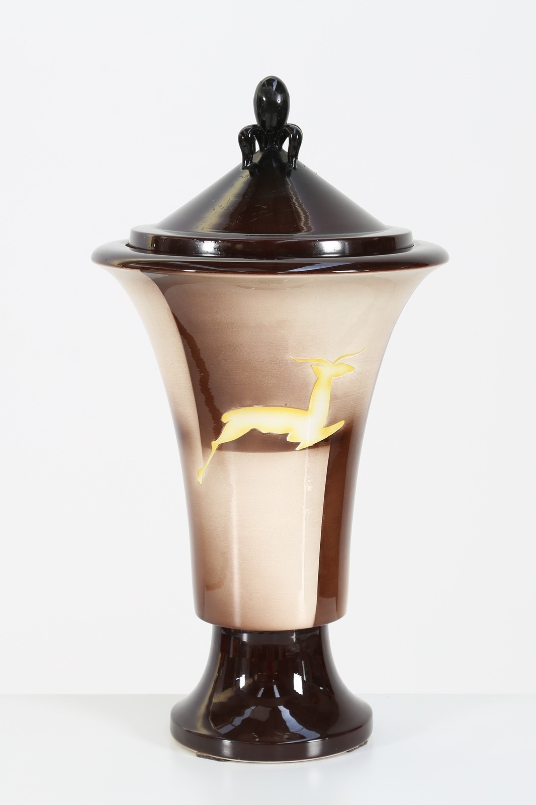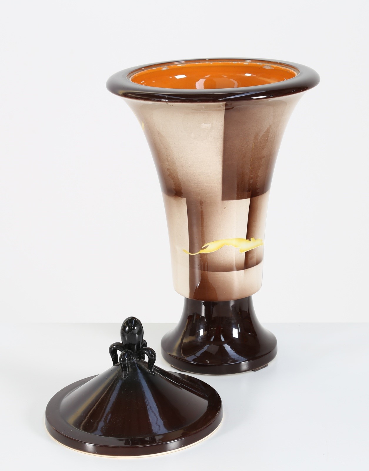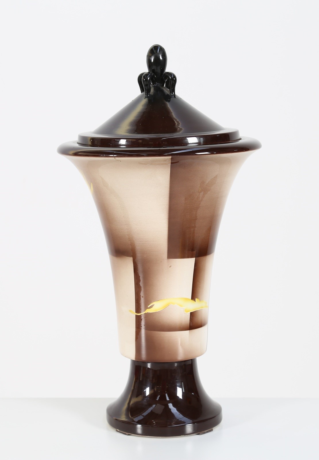 GALVANI ANDREA Gande vaso con coperchio in ceramica con decoro all'aerografo. Galvani Pordenone, anni 30 . -. Cm 26,00 x 48,00 x 26,00. Marchio presente