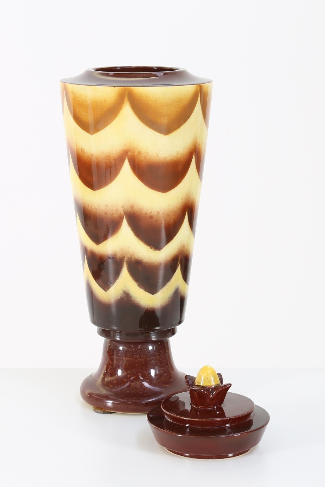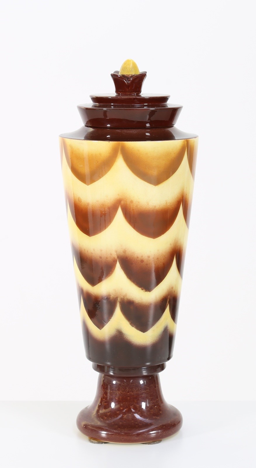 GALVANI ANDREA Grande vaso con coperchio in ceramica con decoro all'aerografo. Galvani Pordenone, anni 30. -. Cm 16,00 x 44,00 x 16,00. Marchio presente