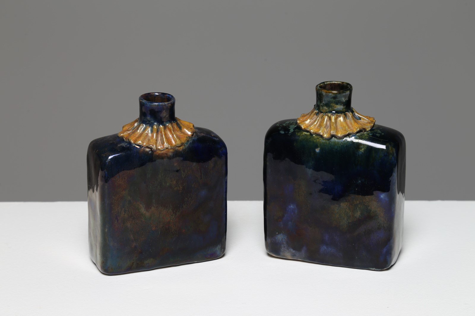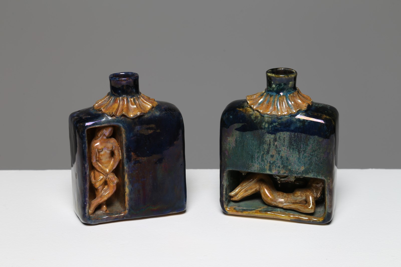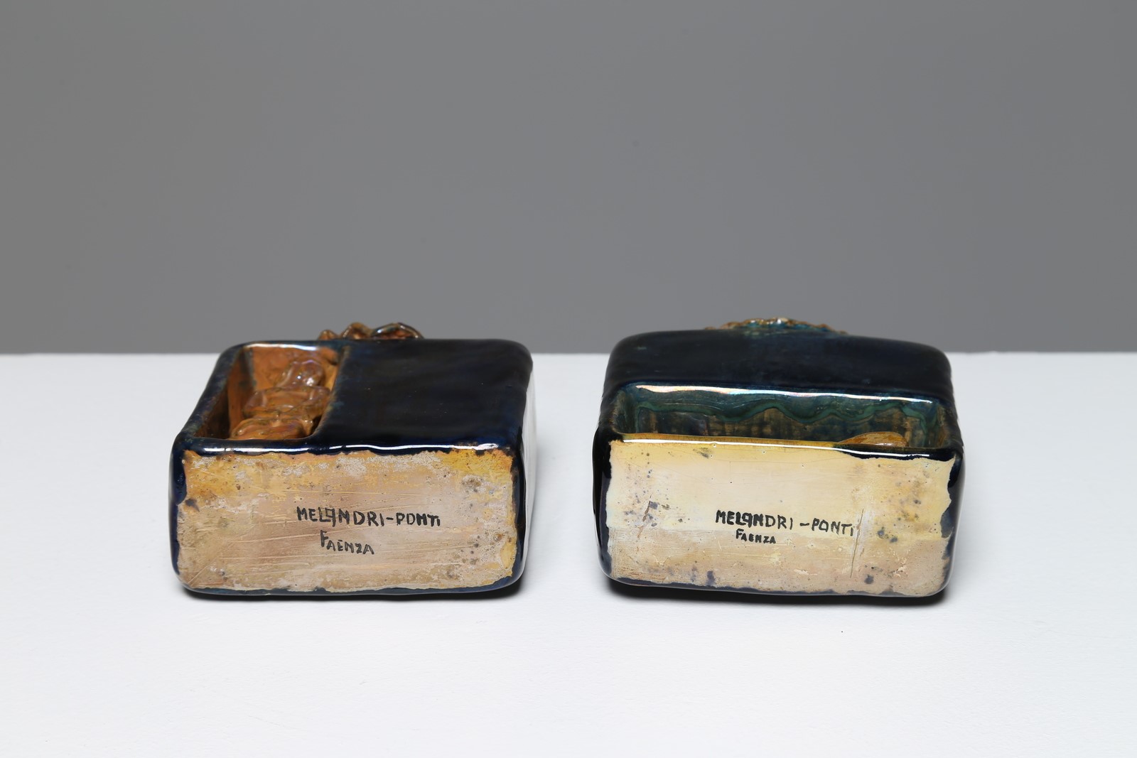 GIO PONTI E PIETRO MELANDRI Coppia bottiglie-vasettI, scultura in ceramica, disegnate da Giò Ponti e realizzate da Pietro Melandri, Faenza, 1947. . Cm 10,00 x 13,00 x 4,50. Firma alla base Melandri -Ponti