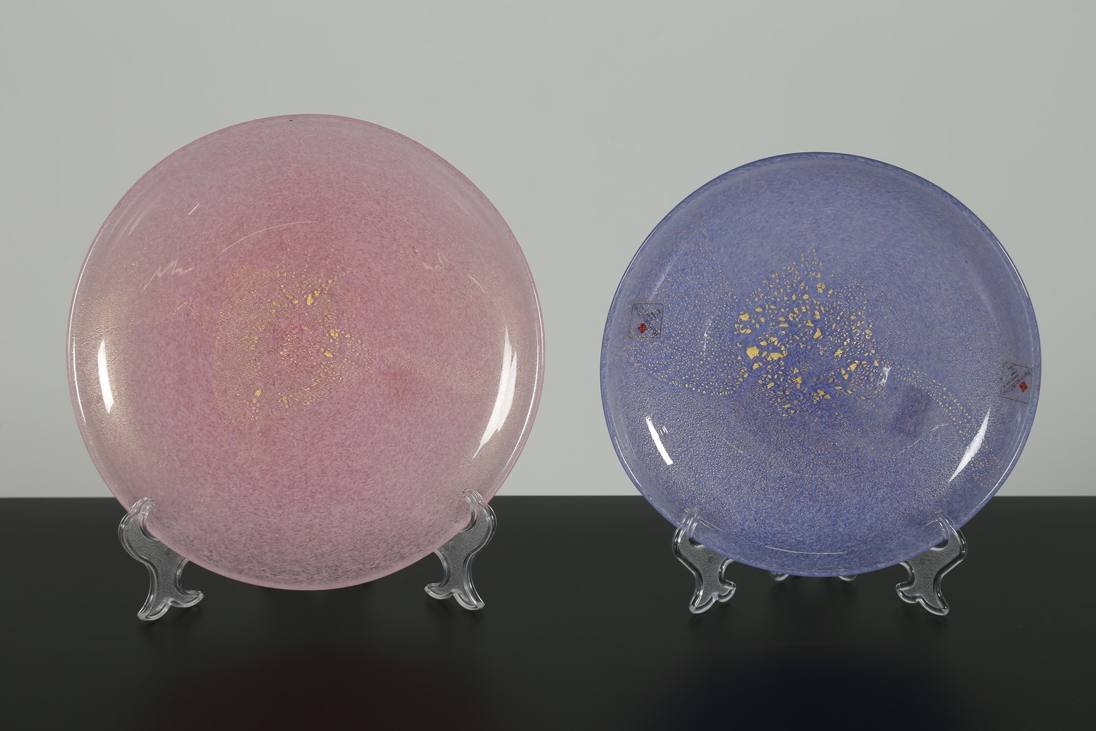 BAROVIER & TOSO Coppia di piatti in vetro bollicine e foglia oro, anni 40. -....